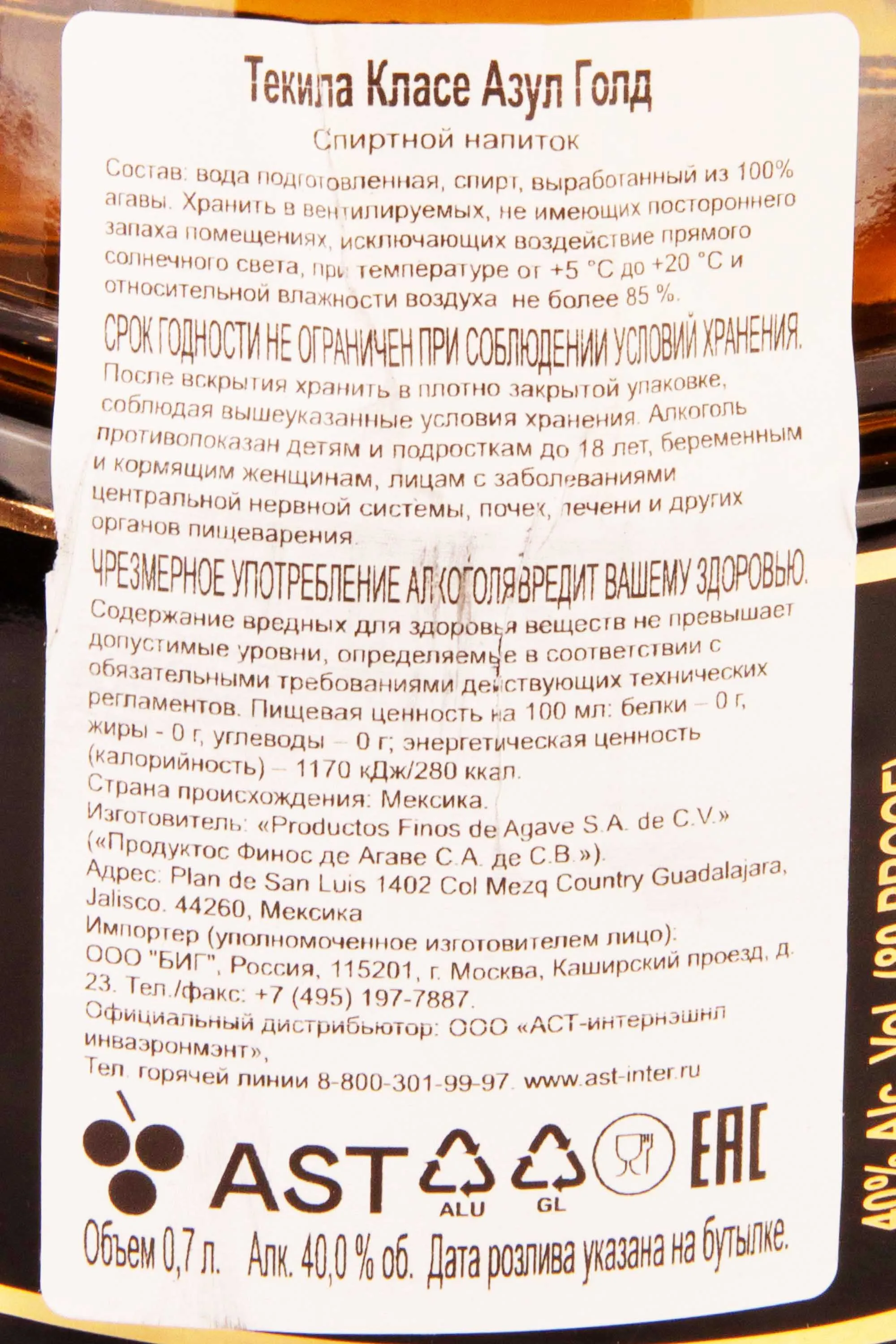 Содержит не менее 51% сока голубой агавы, оставшийся объем может быть дополнен сахарным сиропом или другими сахаросодержащими добавками.