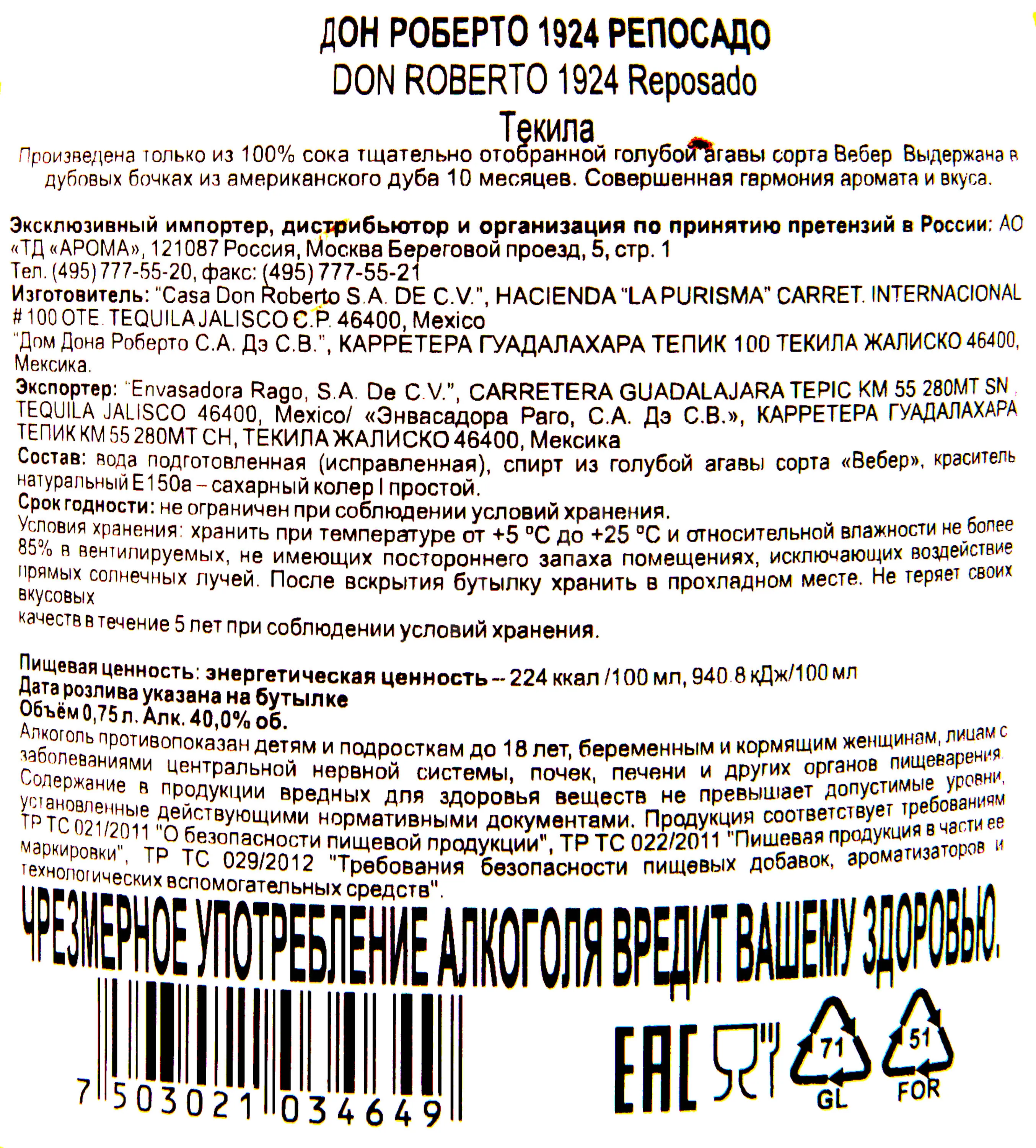 Don Roberto 1924 Reposado 0.75 л купить - Текила Дон Роберто 1924 Репосадо цена в магазине