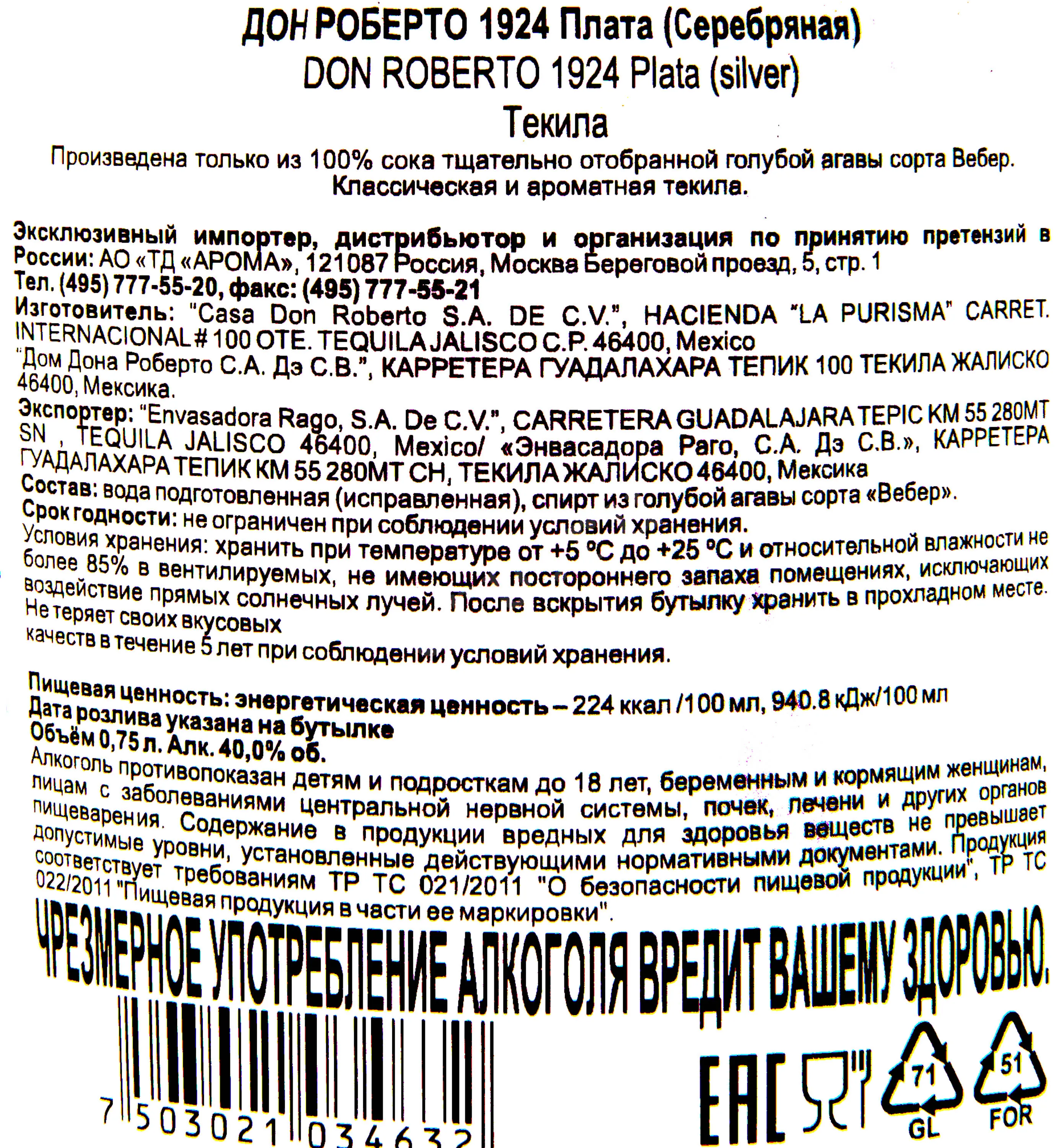 Текила Don Roberto Plata 1924 Silver 0.75 л