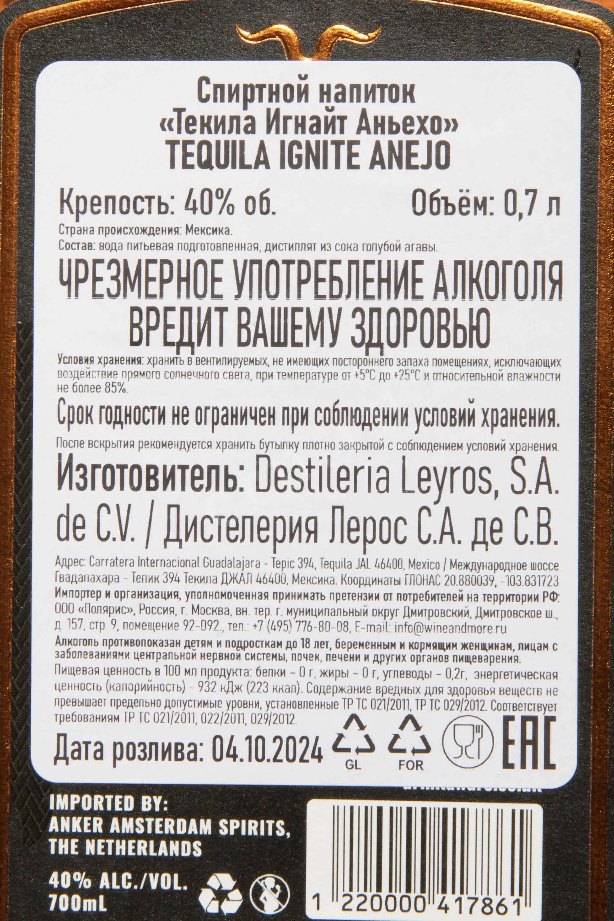 Текила Ignite Anejo 0.7 л производилась из отборной голубой агавы, выращенной в традиционных мексиканских регионах. Для получения насыщенного характера использовалась медленная ферментация и дистилляция в медных перегонных кубах, что позволяло максимально раскрыть природную сладость и пряность растения. Напиток проходил длительное выдерживание в дубовых бочках, где набирал глубину вкуса и округлость аромата. Контакт с деревом придавал структуру, мягкость и тонкие оттенки пряностей, благодаря чему напиток отличился особым благородством. Производители уделяли внимание не только технологии, но и гармоничному сочетанию традиций с современными методами, что сделало результат сбалансированным и выразительным.