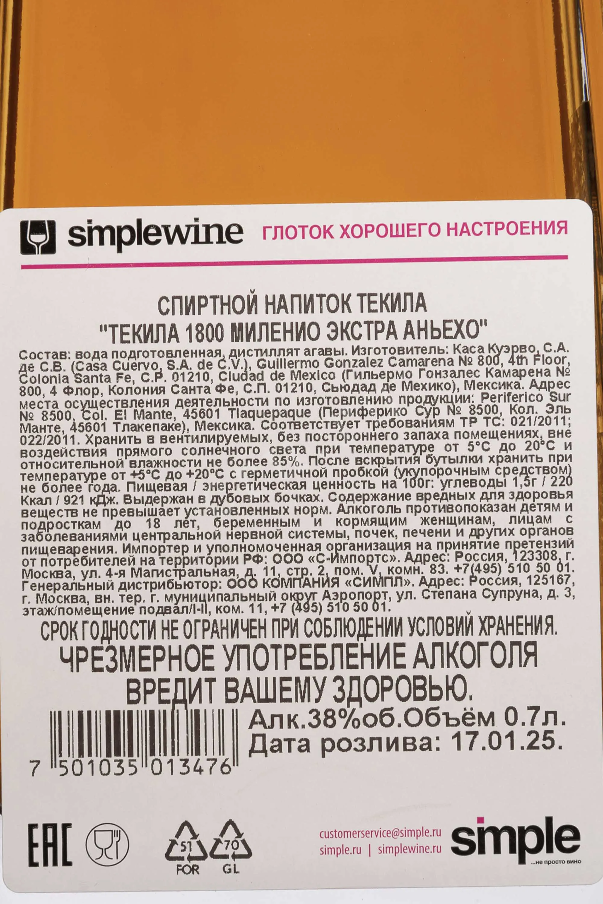 Jose Cuervo 1800 Milenio Extra Añejo — это премиальная текила ультра-выдержки, созданная из 100 % голубой агавы Weber и отражающая высочайшие стандарты дома Jose Cuervo. Для производства используется двойная дистилляция в медных аламбиках, после чего напиток выдерживается в бочках из американского дуба, а затем проходит дополнительную финишную выдержку в бочках из-под коньяка. Поставляется в элегантной подарочной коробке, что делает Milenio отличным выбором для особых случаев и коллекций. Эта текила ориентирована на медленную дегустацию и ценителей сложных, многослойных крепких напитков, сопоставимых по стилю с выдержанными коньяками и виски.