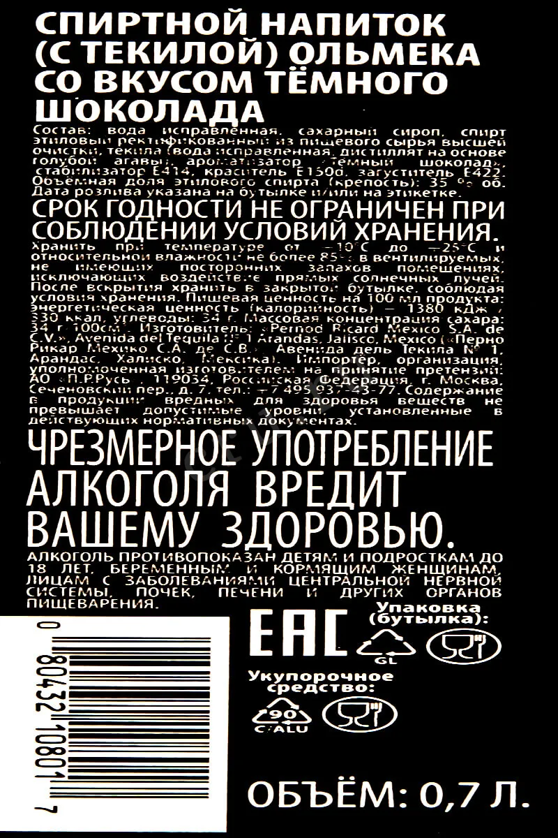 Текила Olmeca Dark Chocolate 0.7 l — это эксклюзивный мексиканский алкоголь, созданный из дистиллята голубой агавы с добавлением эссенции какао-бобов. Напиток крепостью 35% был отмечен бронзовой медалью на дегустационном конкурсе в Лондоне.