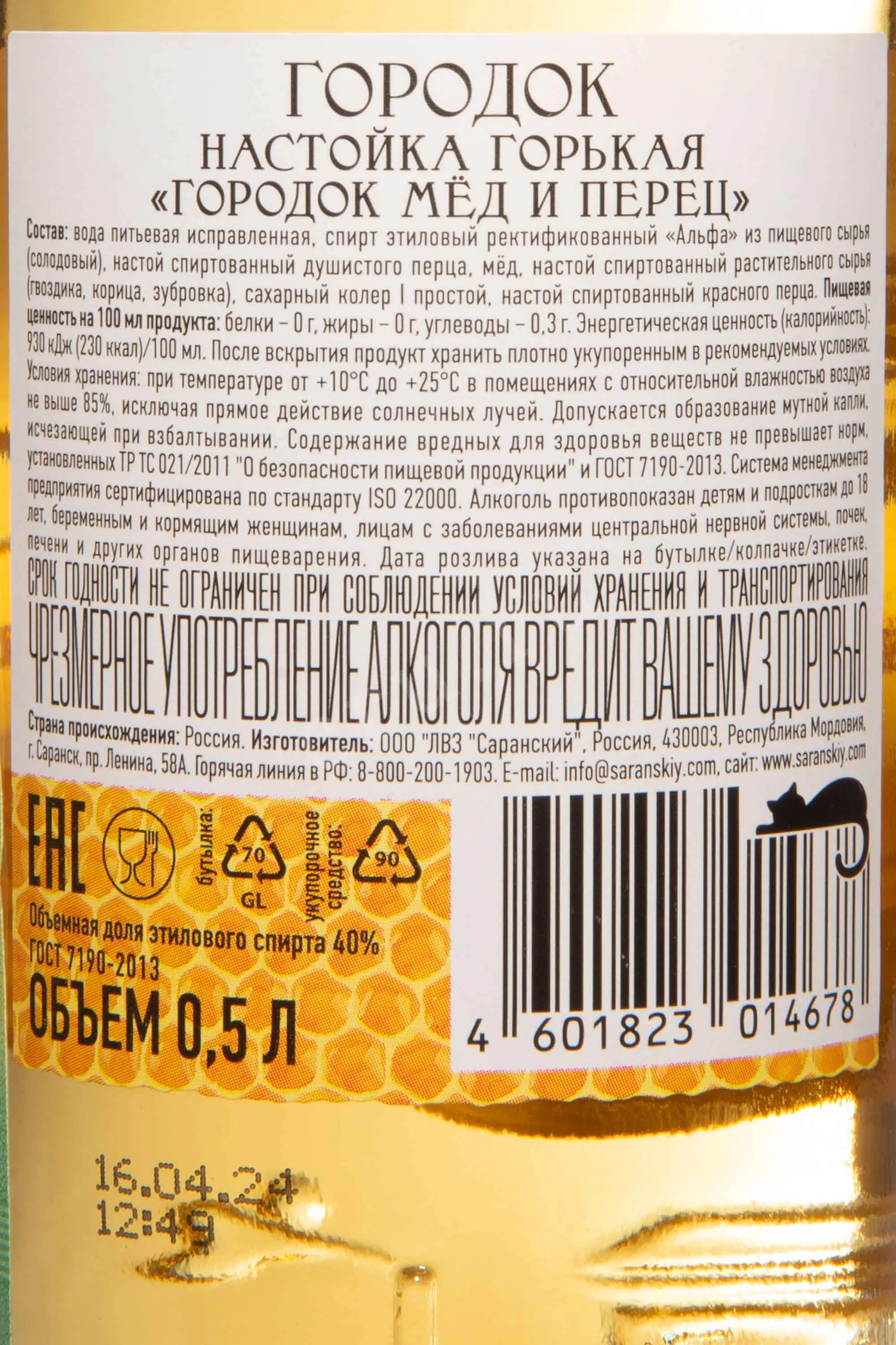Настойка Городок Мёд и перец 0.5 л