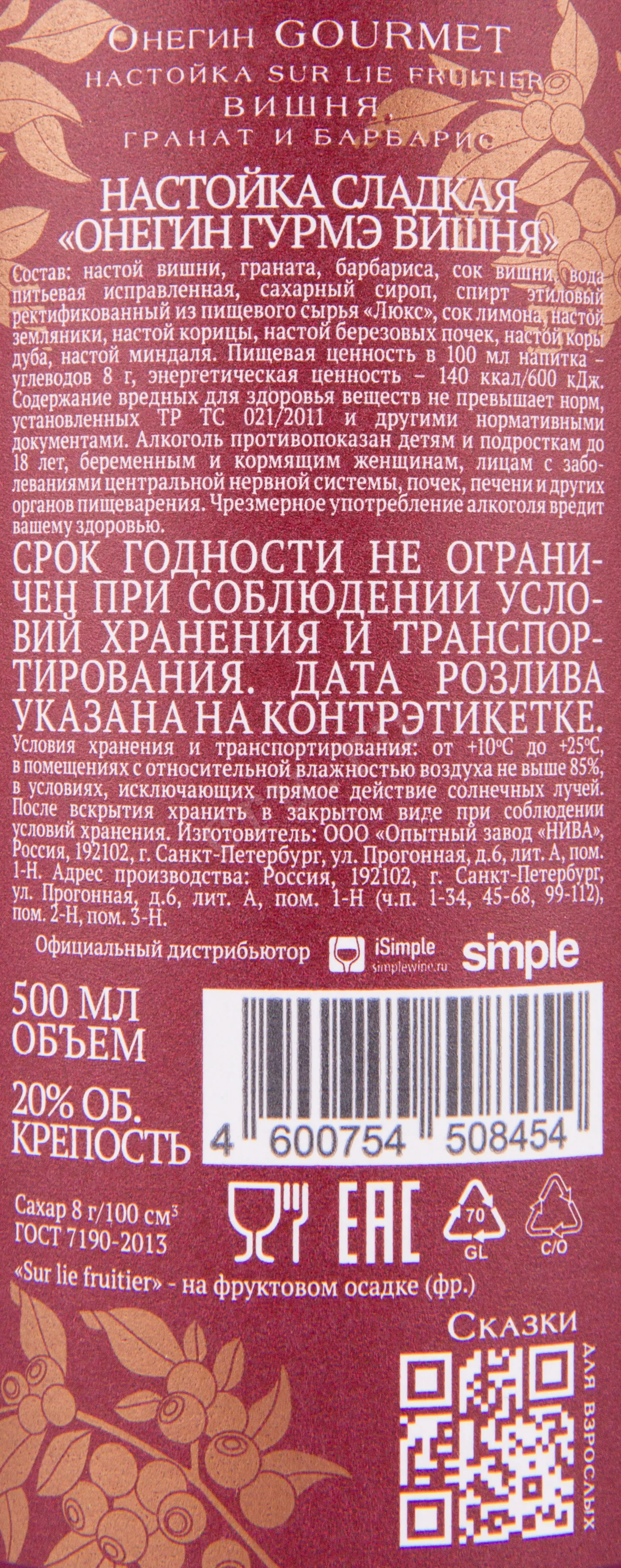 Онегин Гурмэ Вишня 0.5 л — это изысканная сладкая настойка, созданная по уникальной технологии Sur Lie Fruitier (выдержка на фруктовом осадке). Напиток представляет собой сложный купаж, где доминирующая спелая вишня гармонично дополнена терпкостью граната и легкой кислинкой барбариса. Мастера петербургского завода «НИВА» используют только натуральные ингредиенты: спирт класса «Люкс», соки и настои ягод, а также секретный набор ботаникалов, включающий корицу, миндаль, березовые почки и кору дуба. Благодаря выдержке на осадке настойка обретает исключительную мягкость, плотность и многогранный вкусовой профиль. Это современное прочтение классических русских традиций, где каждая деталь — от состава до оформления — подчеркивает премиальный статус продукта. Напиток станет прекрасным завершением ужина или основой для авторских коктейлей, даря глубокое наслаждение ценителям натуральных десертных алкогольных напитков с богатой историей и благородным характером.