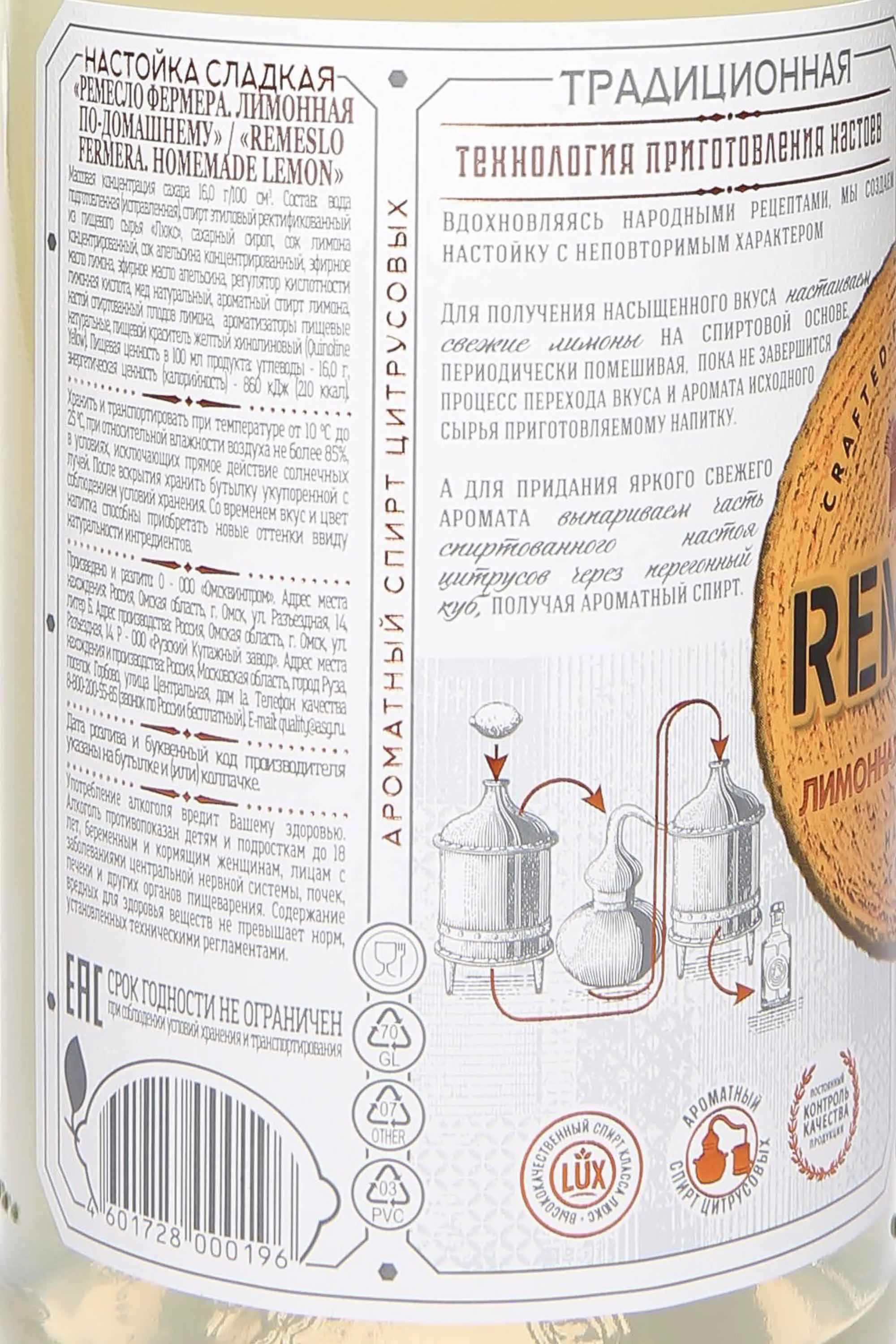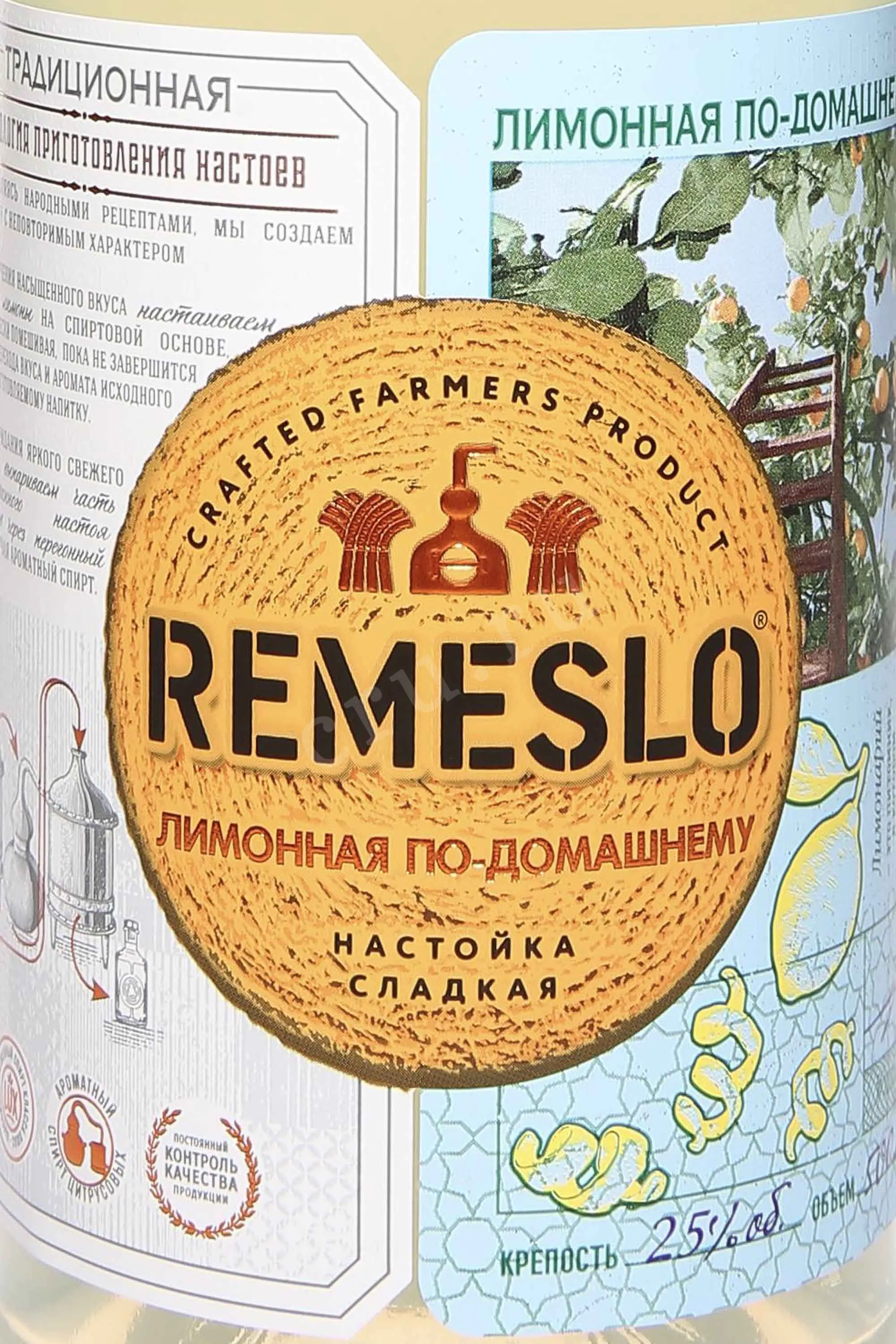Настойка Ремесло Лимонная по-домашнему сладкая 0,5 л — это напиток, приготовленный по народным рецептам с опорой на традиционные методы. Для его создания используют свежие лимоны, которые настаиваются на спиртовой основе с периодическим перемешиванием. Такой способ обеспечивает насыщенность вкуса и плавный переход цитрусовых акцентов в мягкие сладкие тона. В рецепте также присутствуют мед, сок лимона и апельсина, благодаря чему купаж получает глубину и многослойность, а дистиллят из цитрусово-спиртового настоя придает свежесть и яркость. В результате получается образец с ярким ароматом и гармоничным балансом сладости и кислинки.