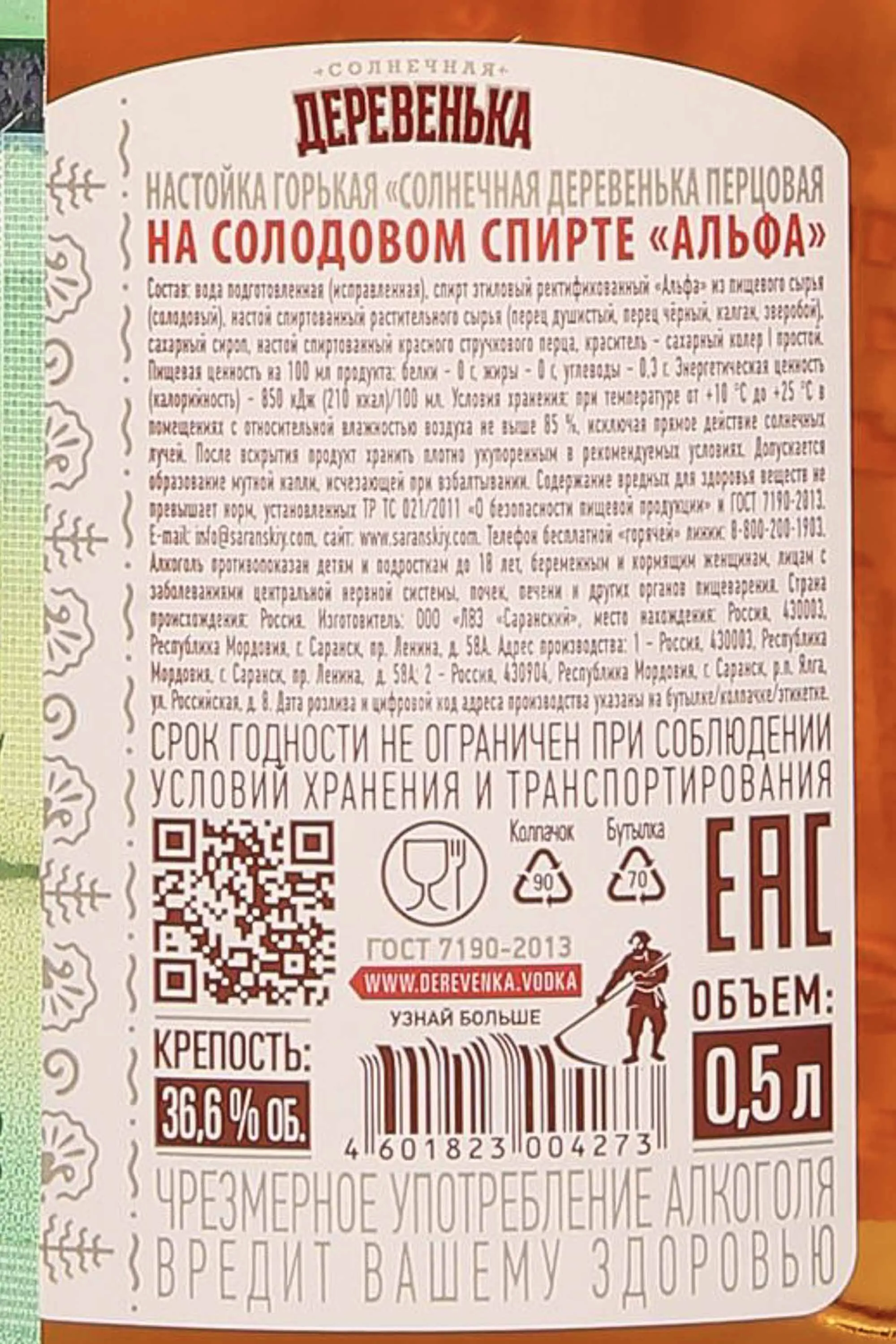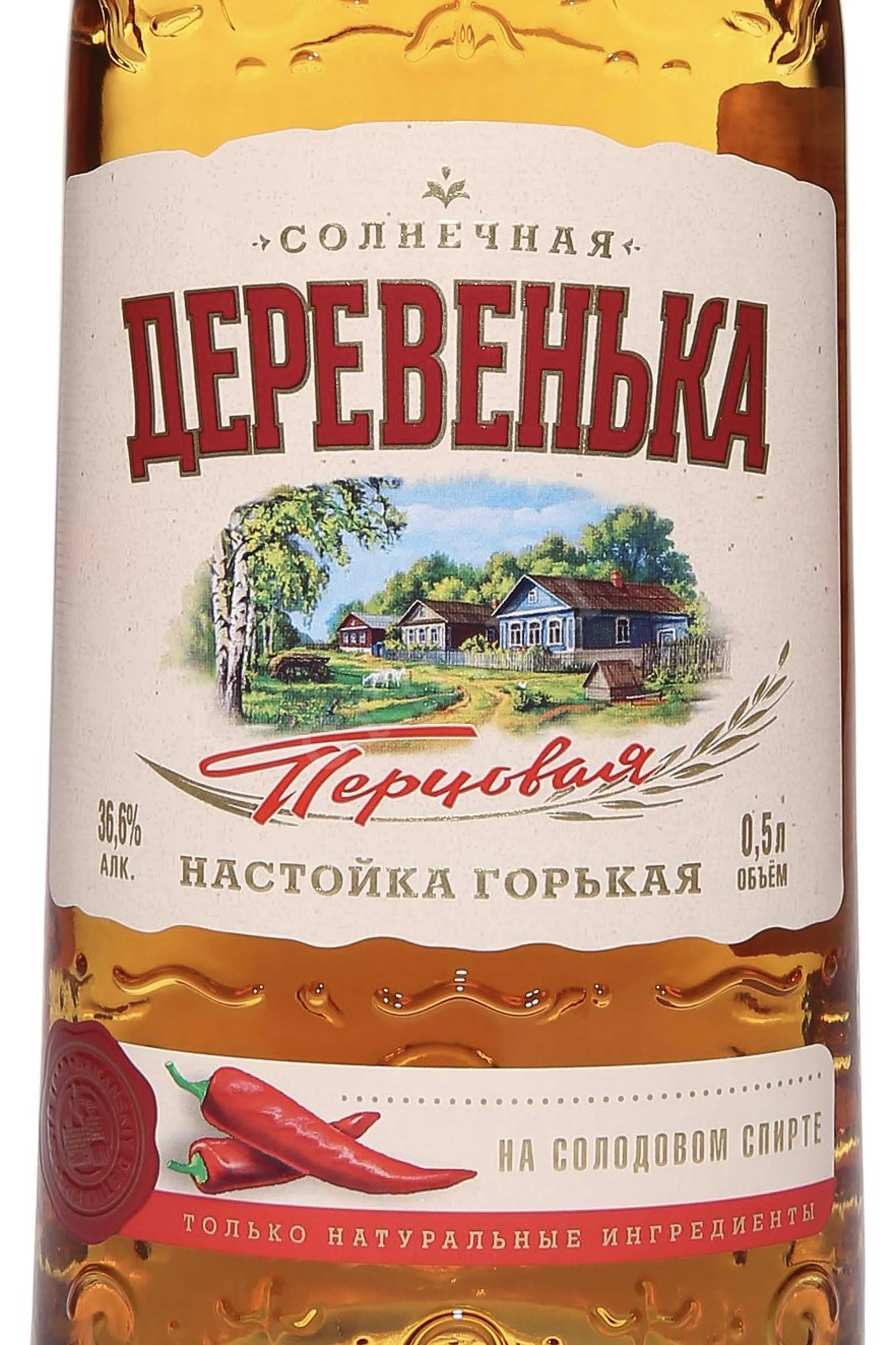 Настойка Солнечная Деревенька Перцовая Горькая 0,5 л создана в традиционном русском стиле. Базой для нее стал зерновой спирт, на котором настаивали стручковый красный перец. В производстве использовалось натуральное сырье, что придало напитку характерный вкус и согревающий эффект. Он занимает особое место среди горьких настоек благодаря яркому пряному характеру и гармоничному сочетанию жгучести и мягкости. Алкоголь хорошо зарекомендовал себя среди ценителей крепкой классики. Его отмечают за сбалансированность, натуральность и чистоту вкуса.