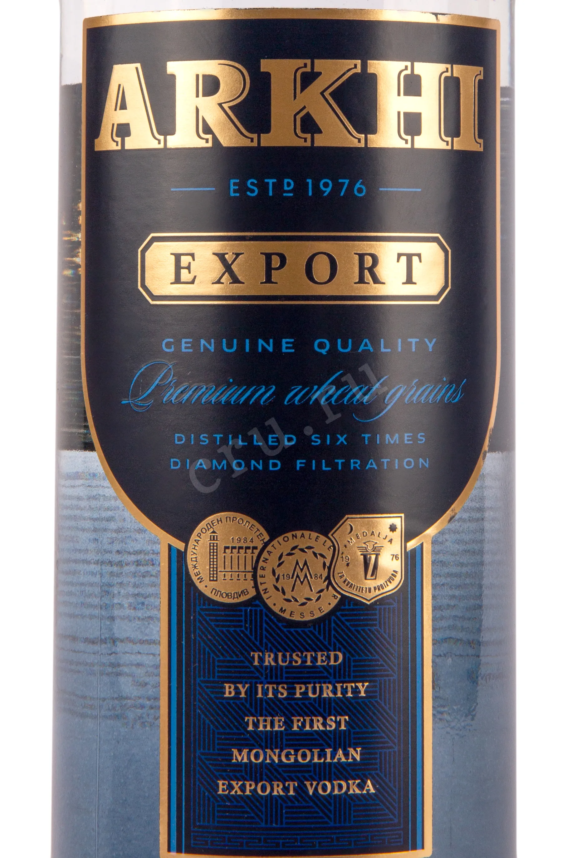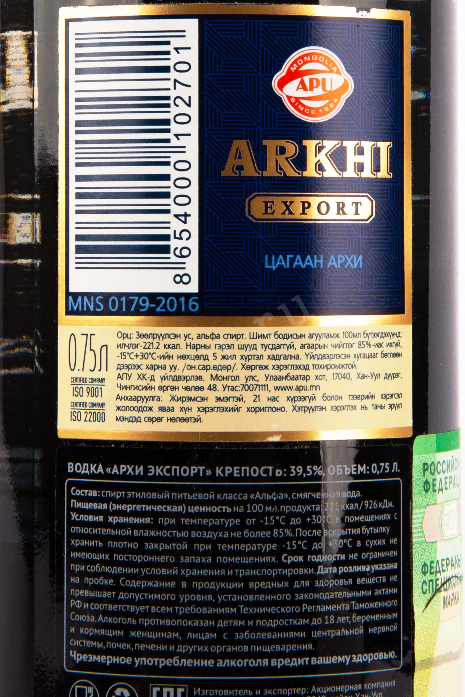 Водка Архи Экспорт 0,75 л — монгольская водка, представленная компанией «АПУ», одним из крупнейших производителей алкоголя в стране. Напиток обладает крепостью 39% и создан на основе зернового спирта из озимой пшеницы с добавлением специально подготовленной воды. Традиционное название «Архи» отсылает к историческим истокам монгольского дистиллята, первоначально производимого из кобыльего молока.