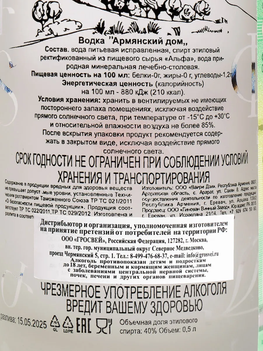 Водка Армянский Дом 0.5 л — это высококачественный спиртной напиток, отличающийся особой мягкостью и чистотой. Производится с использованием природной минеральной лечебно-столовой воды, что придает ей уникальные вкусовые характеристики. В процессе изготовления водка проходит несколько этапов фильтрации, что способствует достижению безупречной прозрачности и мягкости. Она завоевала признание на международных конкурсах, где ее отметили за отличное качество и гармоничный вкус. Бренд Армянский Дом сочетает традиционные методы производства с современными технологиями, что позволяет достичь отличных показателей качества.