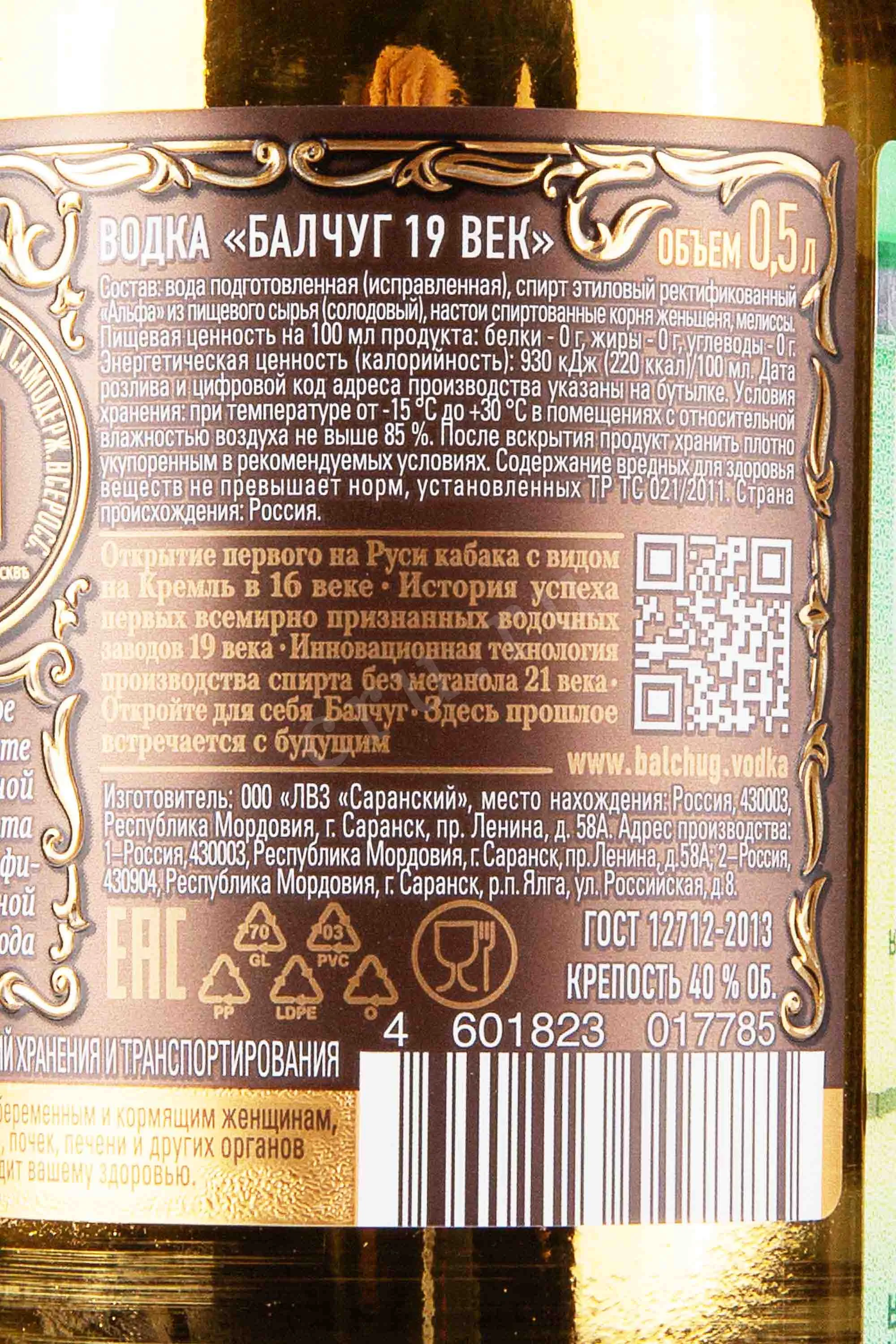 Водка Балчуг 19 век 0.5 л