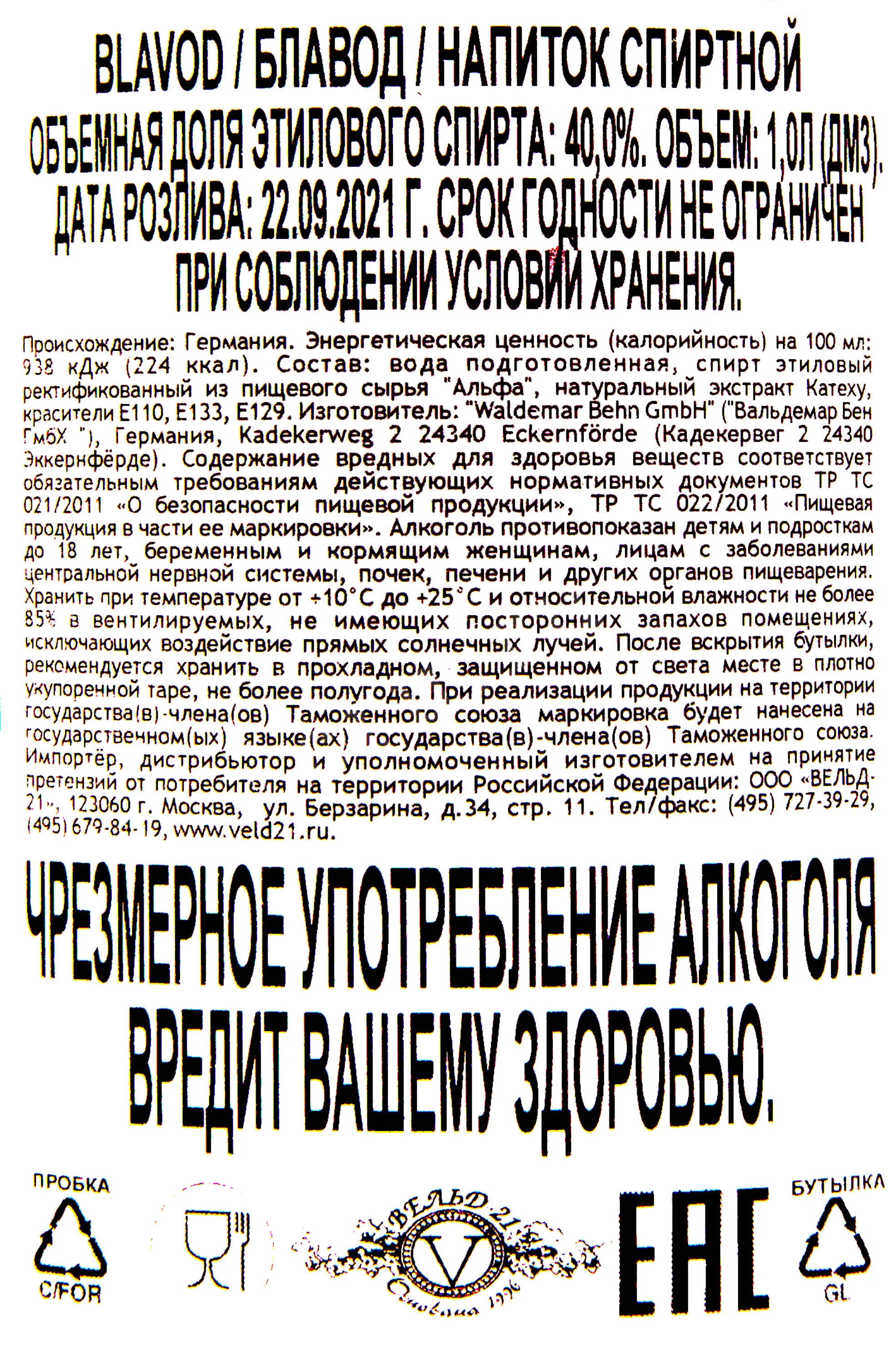 Водка Blavod 1 l – это уникальный немецкий алкоголь, созданный в конце 20 столетия. Изготавливается напиток на базе ректификованного спирта категории «Альфа» из зернового сырья. Дистиллят подвергается фильтрации с помощью кокосового угля, благодаря чему лишается ненужного осадка. Затем алкоголь смешивается с питьевой исправленной водой до крепости 40%. Также в составе водки имеется необычный компонент – экстракт катеху, придающий напитку черный цвет. Готовое спиртное разливается в вытянутые сосуды объемом 1 л с яркой красной надписью на лицевой стороне.