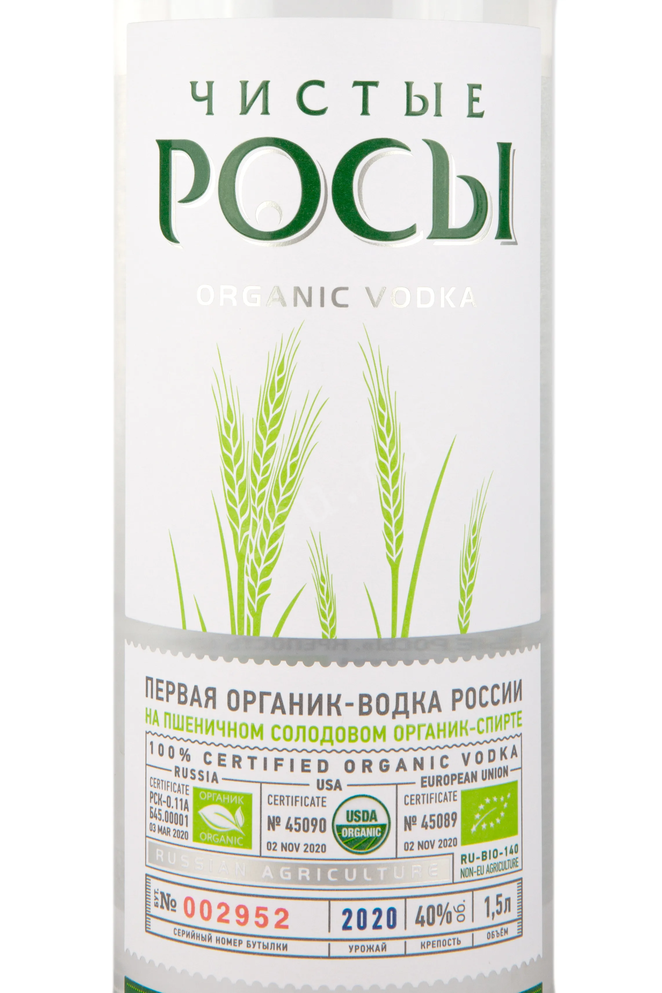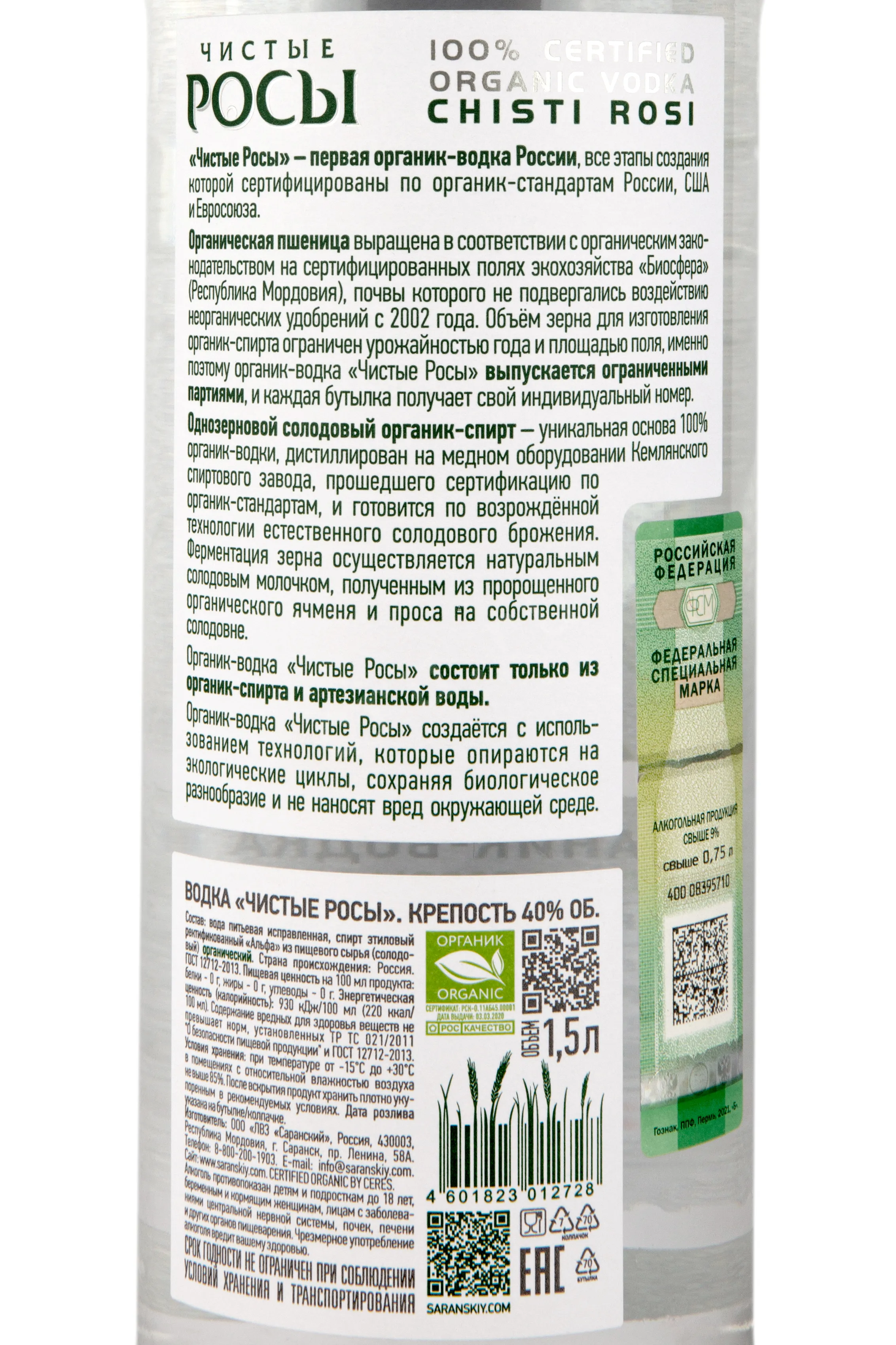 Водка Чистые Росы 1.5 л — органическая, суперпремиального уровня. Впервые в России она произведена из сертифицированного органического зерна. Пшеницу выращивают в Мордовии на полях, которые не обрабатывались химическими средствами более 20 лет. Урожайность ограничена, поэтому водку делают небольшими партиями. Применяется старинная технология натурального брожения сусла (используется солодовое молочко из пророщенных ячменя и проса). Спирт получают путем дистилляции в медных аппаратах, купажируют его исключительно артезианской водой. Каждый этап производства опирается на естественные экологические циклы и проходит европейскую биосертификацию AbCert AG. Первая отечественная органическая водка получила золотую медаль на конкурсе «EURASIA SPIRITS DRINKS» сразу в нескольких номинациях, включая «Лучшая водка. Суперпремиальный сегмент» и «ECO Style».