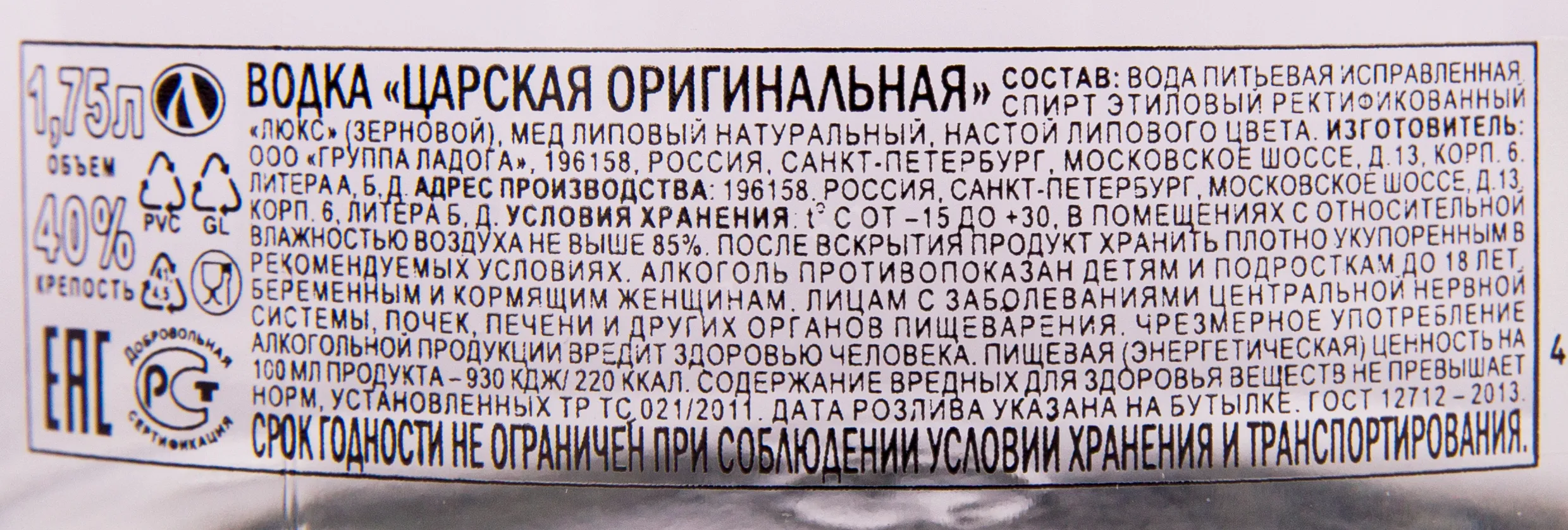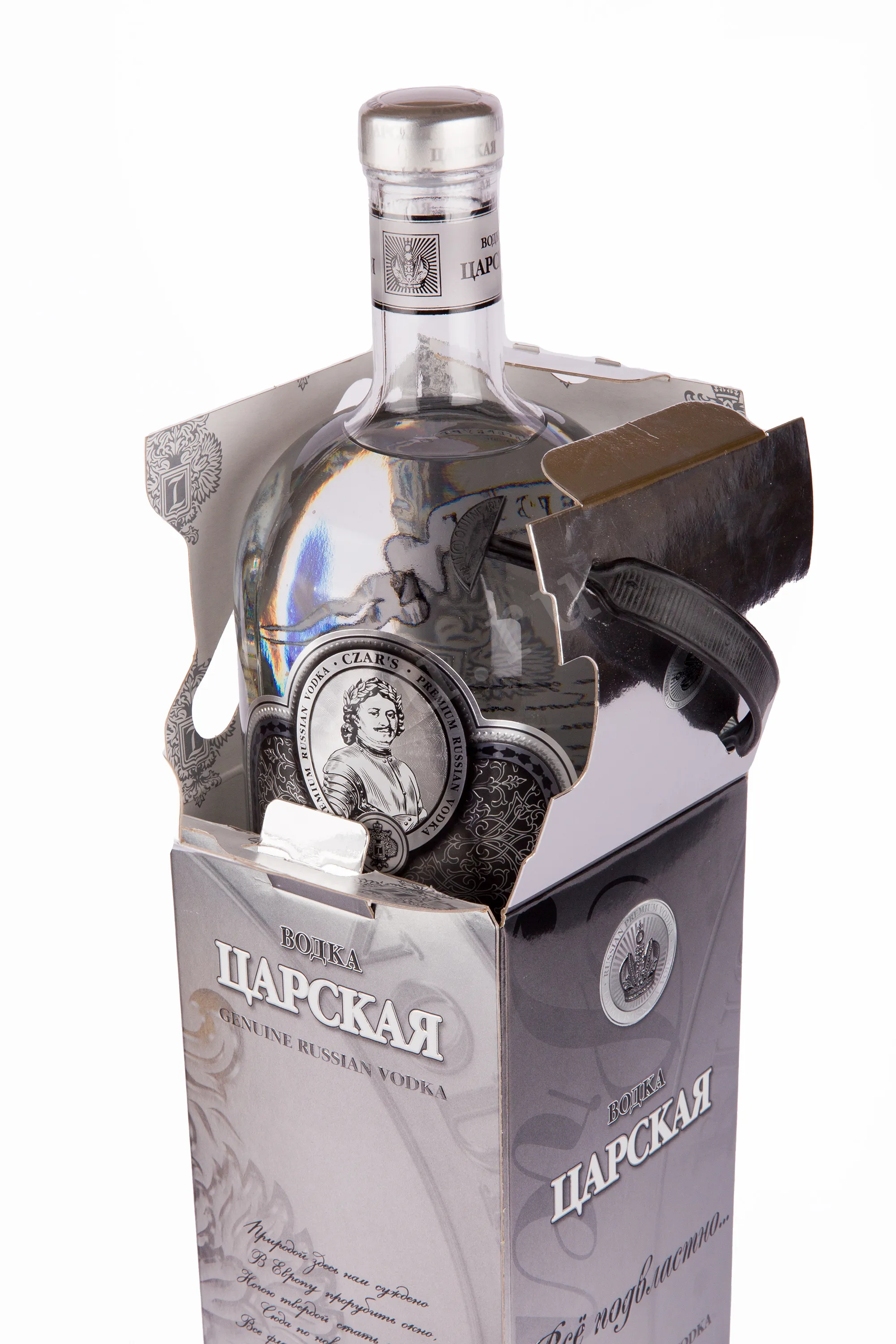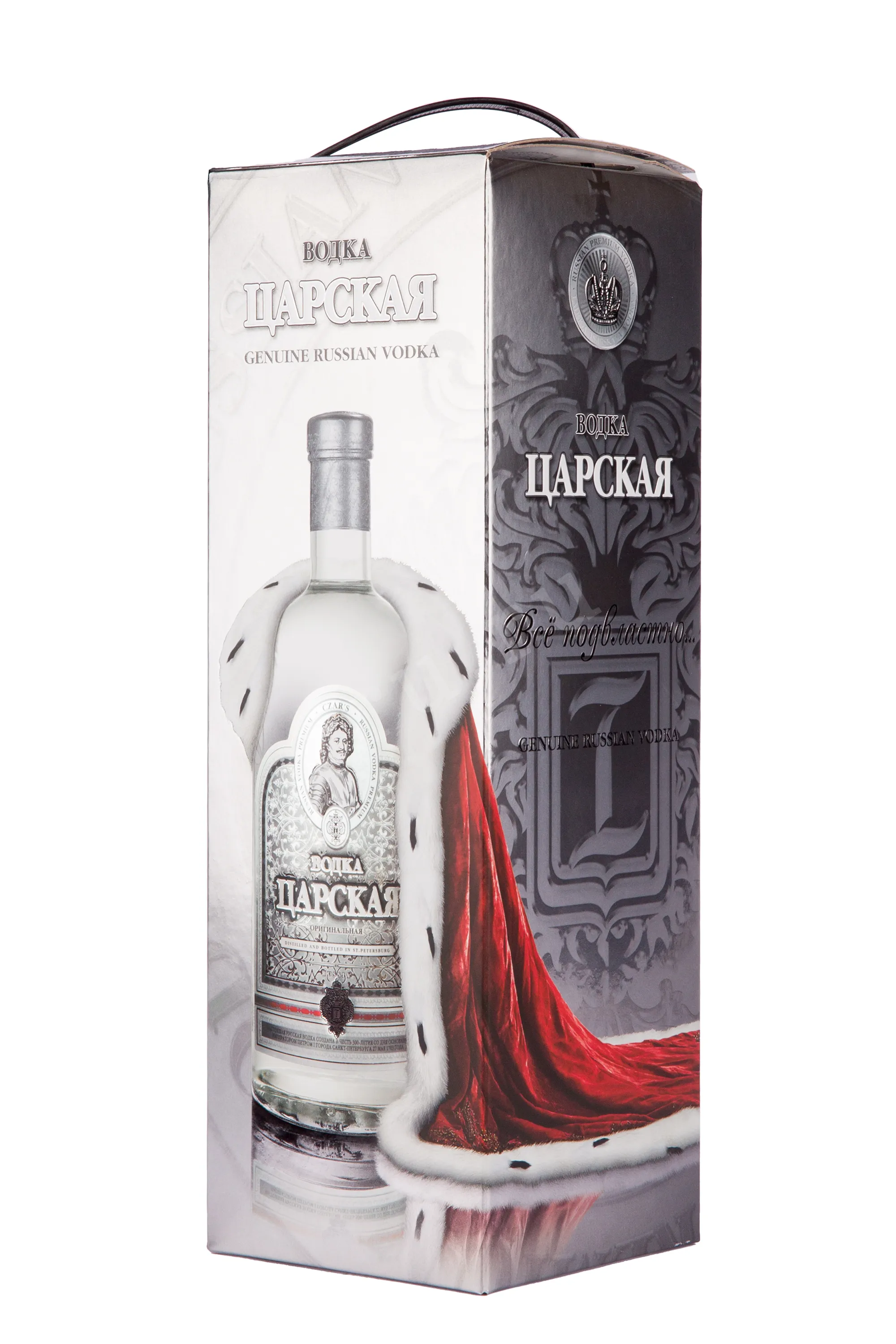 Водка Царская Оригинальная в подарочной коробке 1.75 л — премиальная, с классическим характером и эффектным оформлением. Производится на основе спирта класса «Люкс» и мягкой воды ледникового происхождения из Ладожского озера. Очистка проходит в несколько этапов с применением березового угля и серебра. Это обеспечивает чистоту и ровный вкус. Бутылка выполнена из специального косметического стекла, которое не влияет на состав и сохраняет стабильность напитка в течение всего срока хранения. Дизайн выдержан в имперском стиле. Используются геральдические символы и декоративные элементы с золотым покрытием. Водка удостоена ряда высоких наград на российских и международных конкурсах, среди них золотые медали выставки «Продэкспо».