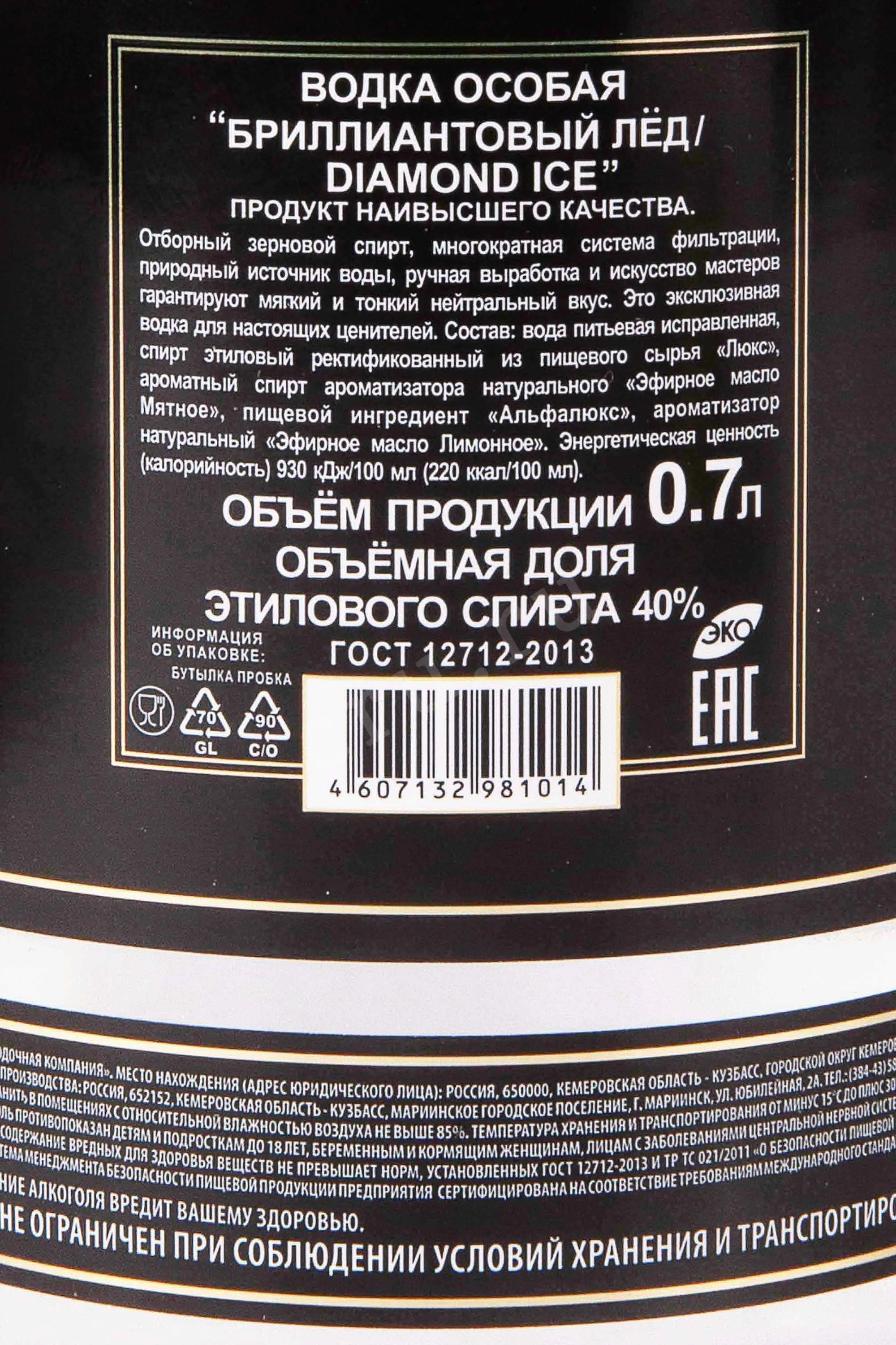 Водка Diamond Ice 0,7 л создается в Сибири по традиционной технологии, но с использованием оригинальной рецептуры. Основной является зерновой спирт класса «Люкс», разбавляемый артезианской водой из глубоких источников, которую дополнительно насыщаются молекулами кислорода и натуральными микроэлементами. В процессе производства добавляются эфирные масла мяты и лимона, придающие напитку особый аромат и вкус. Водка разливается в стильную бутылку с эффектной черной этикеткой. Этот элитный алкоголь притягивает к себе внимание и является отличным вариант для праздничного застолья или подарка.