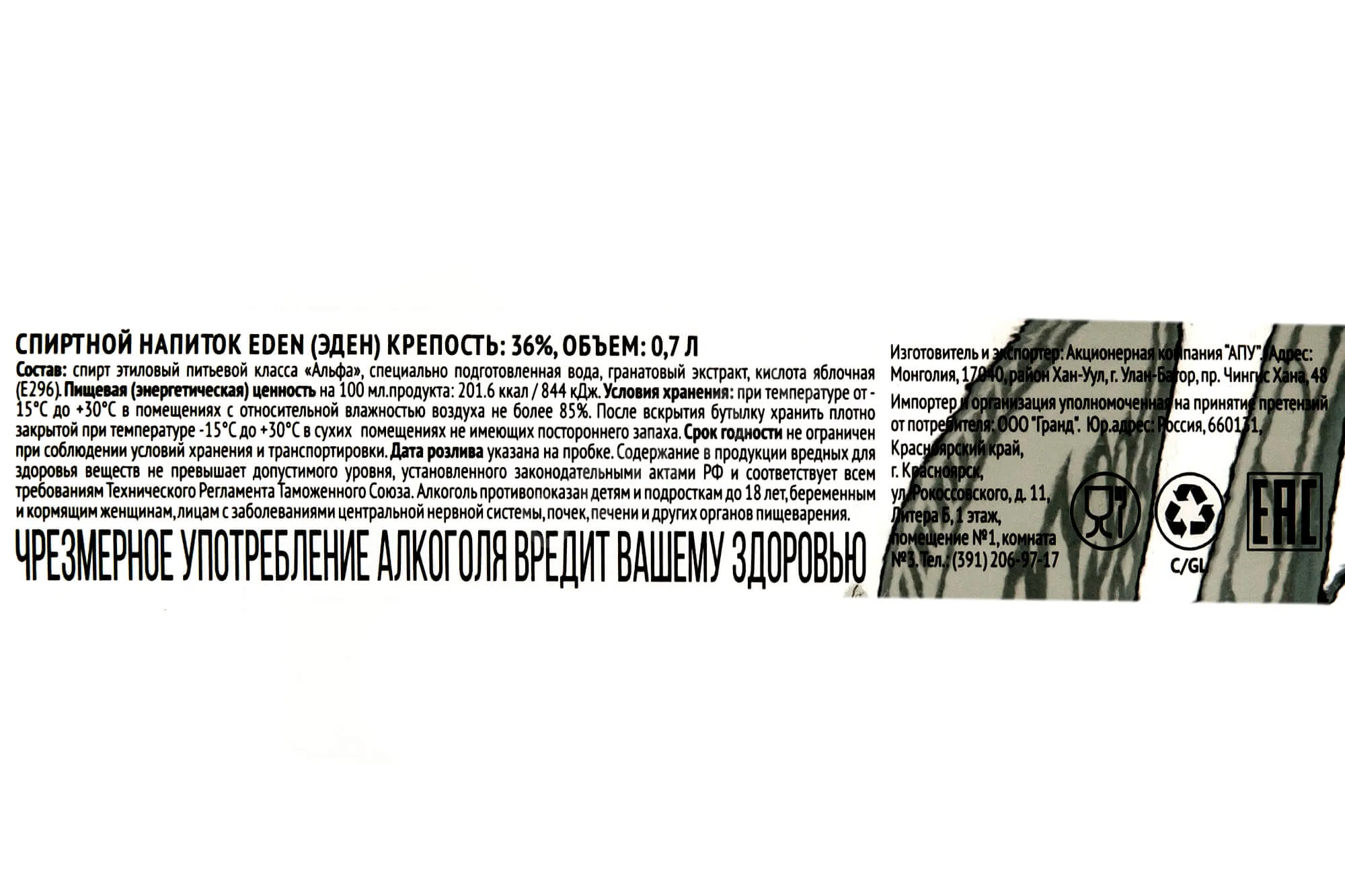Водка Эден в подарочной упаковке 0,7 л — оригинальный спиртной напиток монгольской компании «APU», выпущенный с применением современных технологий. В состав входит качественный спирт «Альфа», очищенная вода, натуральный гранатовый экстракт и яблочный регулятор кислотности. Напиток прозрачный и чистый. В аромате ощущаются тонкие нотки спелого граната, ванили и зерновых полей. Вкус гармоничен, с лёгкими оттенками тёплого хлеба, фруктовыми нюансами и мягкой ванильной кислинкой в финале. Хорошо сочетается с горячими супами, идеально подходит в качестве ингредиента коктейлей, а благодаря изящной упаковке станет прекрасным подарком.