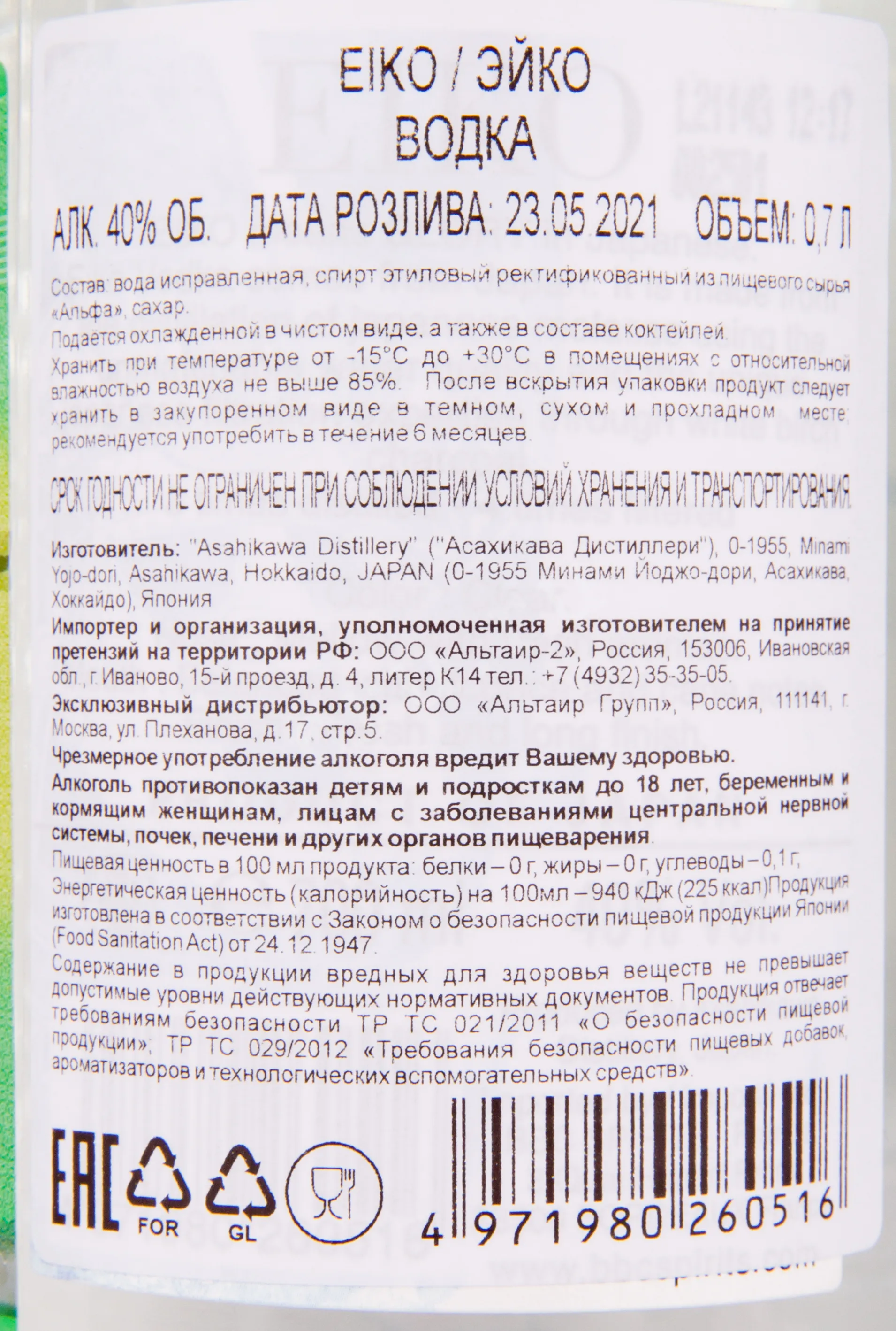 Водка Эйко 0,7 л — элитный напиток японского бренда, в составе которого присутствует необычное сырье: патока сахарного тростника, дополненная водой из родниковых источников, расположенных на территории Хоккайдо. Спиртное перегонялось три раза, после чего его подвергли многократной фильтрации с применением древесного угля и песка. Водка — золотой и серебряный призер многих конкурсов международного масштаба, в том числе «San Francisco World Spirits Competition». Она предлагается в сувенирной упаковке — матовой бутылке, сопровождаемой красивым картонным боксом в сине-голубых тонах с изображением самурая.