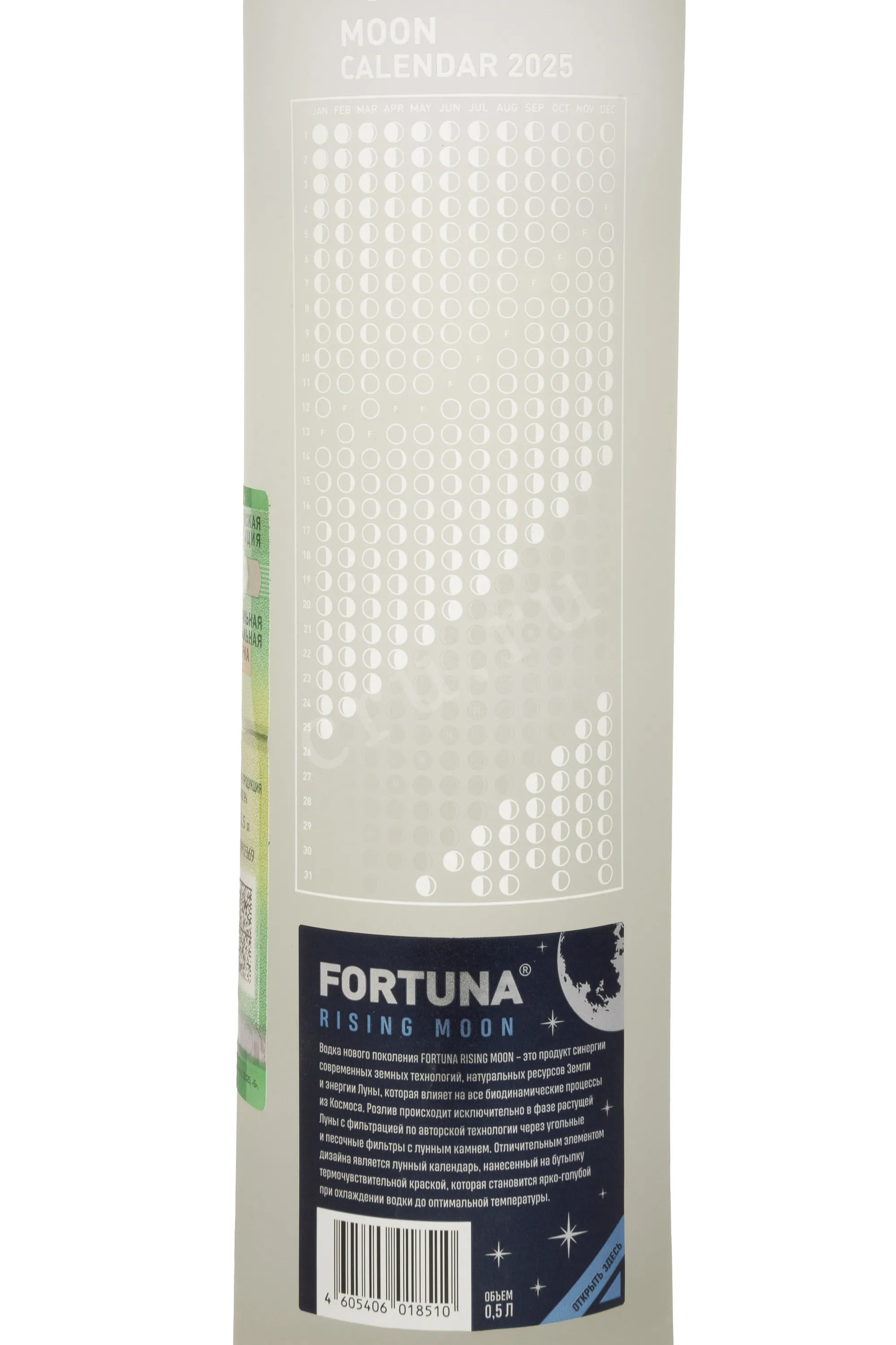 Водка Фортуна Райзинг Мун 0,5 л создана как продукт нового поколения, сочетающий современные земные технологии и энергию Луны. Розлив происходит исключительно в фазе растущей луны, что придает напитку символическое значение и подчеркивает связь с биодинамическими процессами. Для очистки используется авторская технология: фильтрация через угольные и песочные фильтры с добавлением лунного камня. Такой метод обеспечивает исключительную прозрачность и мягкость вкуса. Особенность дизайна бутылки — нанесённый лунный календарь из термочувствительной краски, который при охлаждении до оптимальной температуры становится ярко-голубым. Этот элемент не только декоративный, но и практичный: он указывает момент правильной подачи.