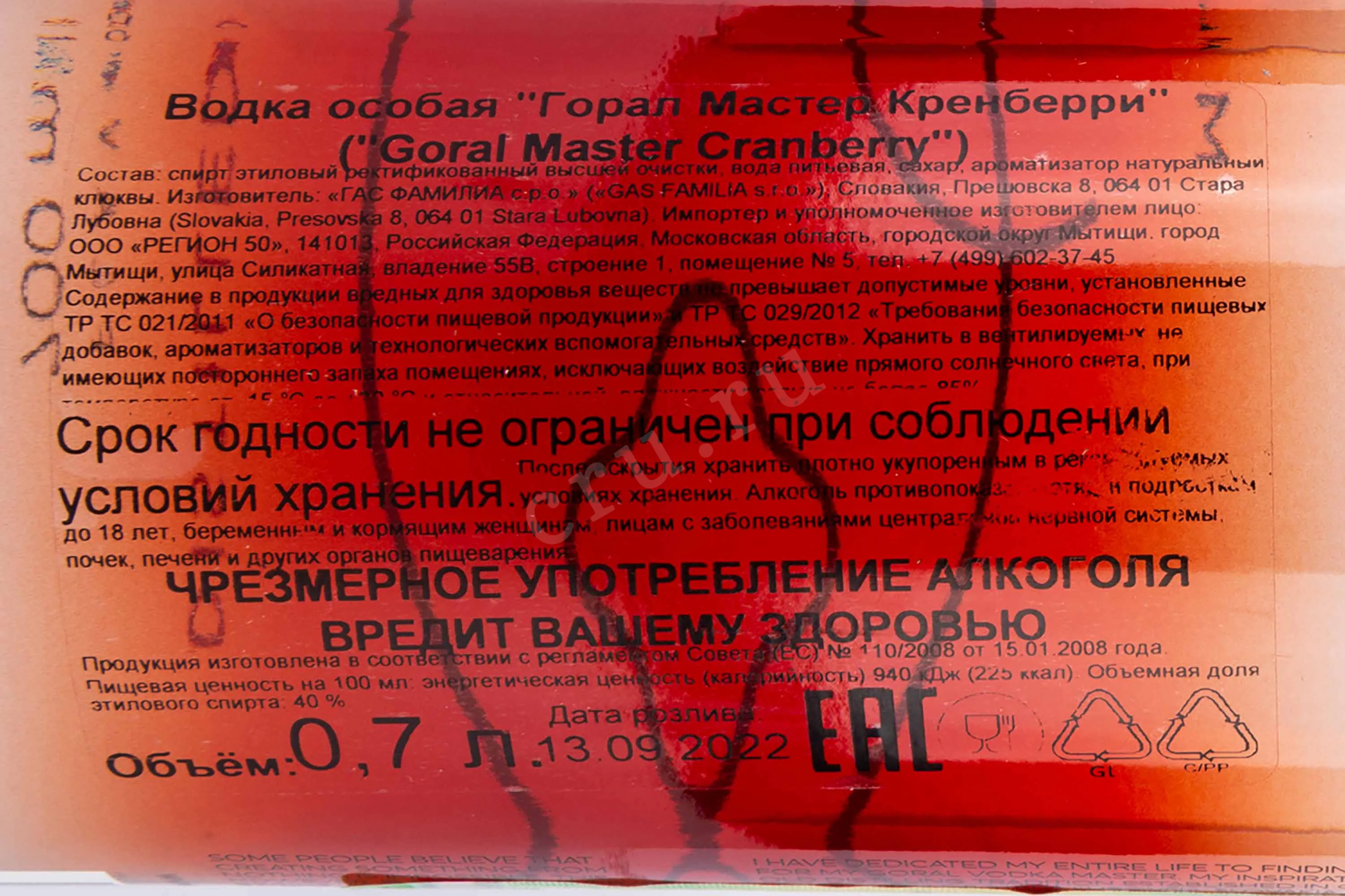 Водка Goral Master Cranberry 0.7 l – это оригинальный словацкий крепкий напиток, выпускаемый на заводе семейной компании Gas Familia. Отборные зерна пшеницы и чистая родниковая вода являются основой этого 40-процентного напитка. Также в состав входит клюквенный экстракт, придающий своеобразную изюминку. Мягкий вкус был достигнут с помощью семикратной дистилляции спирта с последующей очисткой через угольный и алмазный фильтры.