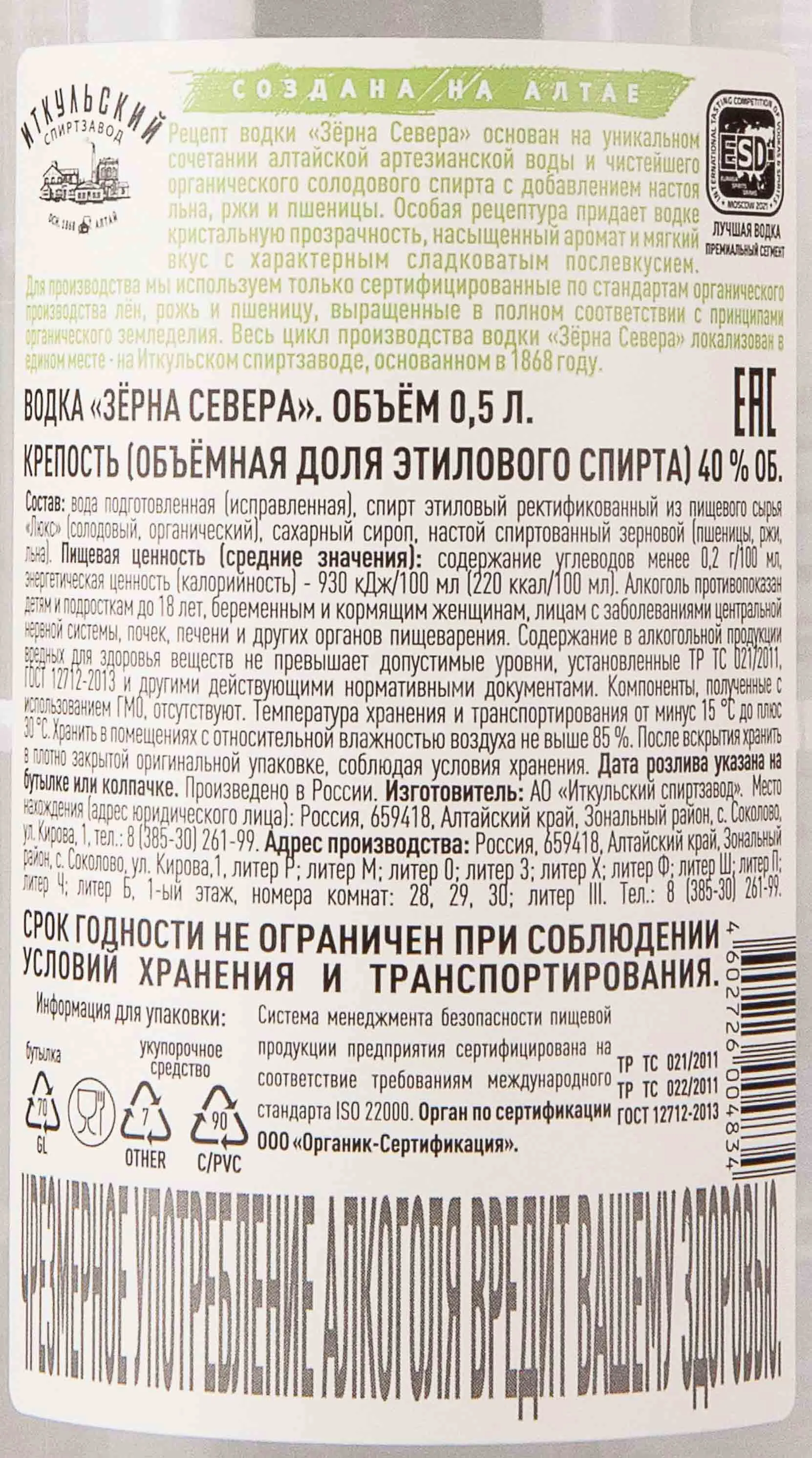 Водка Grains of the North 0.5 l – это органический российский алкоголь, выпускаемый Иткульским спиртзаводом. Основой 40-процентного напитка является чистейший ректификованный спирт категории «Люкс», прошедший шестиступенчатую очистку, и алтайская артезианская вода. В качестве вкусоароматических добавок используются льняной, ржаной и пшеничный настои. Перед розливом спиртное очищается с помощью березового угля. Готовая водка представлена в полулитровых сосудах из прозрачного стекла с пометкой «Organic» на этикетке.