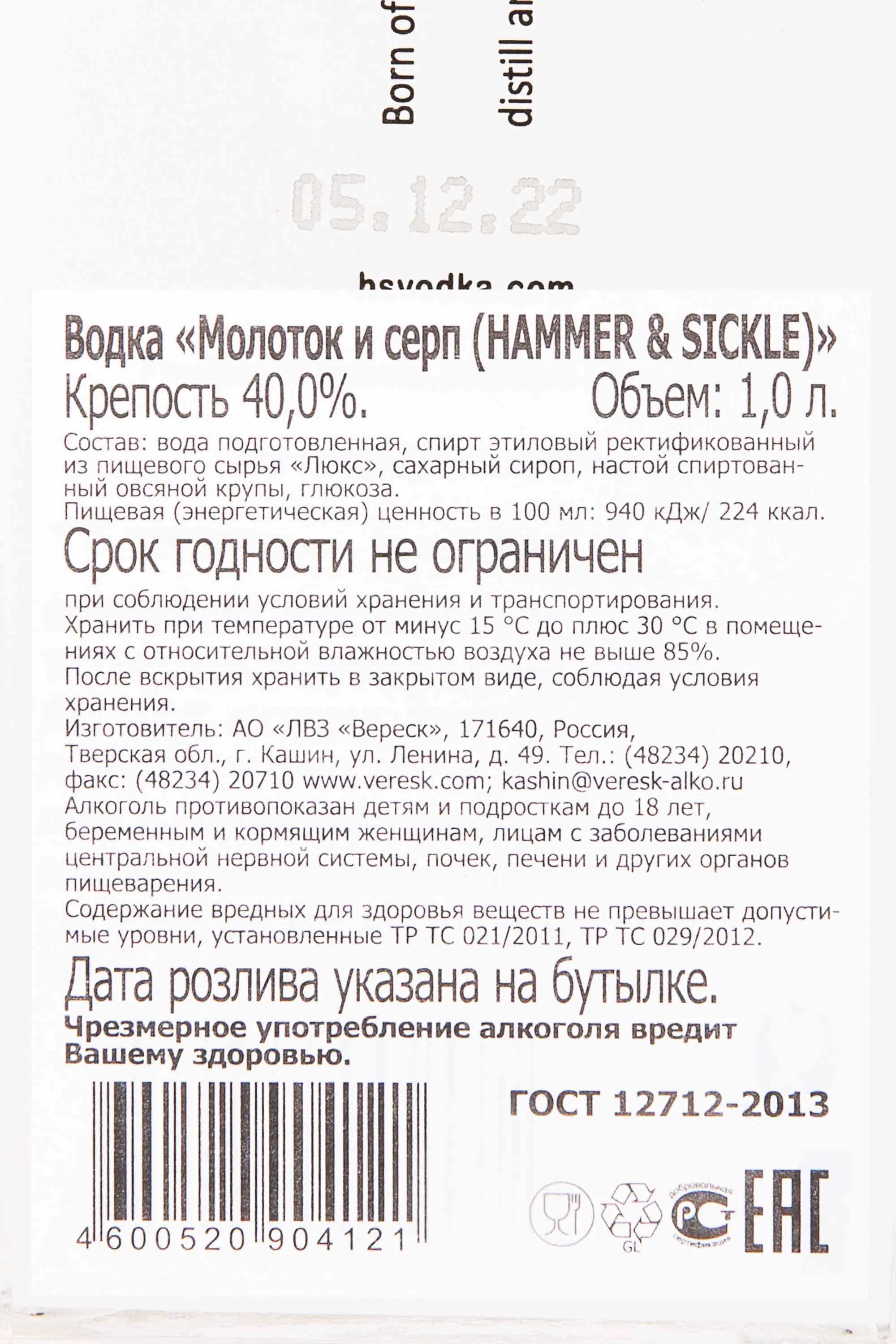 Водка Hammer + Sickle 1 л — ультра-премиальный напиток, созданный в 2007 году командой специалистов из России и США. Основой является высококачественная озимая пшеница, выращенная на плодородных черноземных почвах Тверской области. Для водки используют артезианскую воду, полученную из трех источников, один из которых находится на территории санатория «Кашин». Уникальность производства заключается в шестикратной дистилляции и тщательной фильтрации. Это придаёт водке особенно чистый вкус и исключительную мягкость. Бутылка имеет оригинальный дизайн в духе советского модернизма с изображением красных серпа и молота на этикетке.