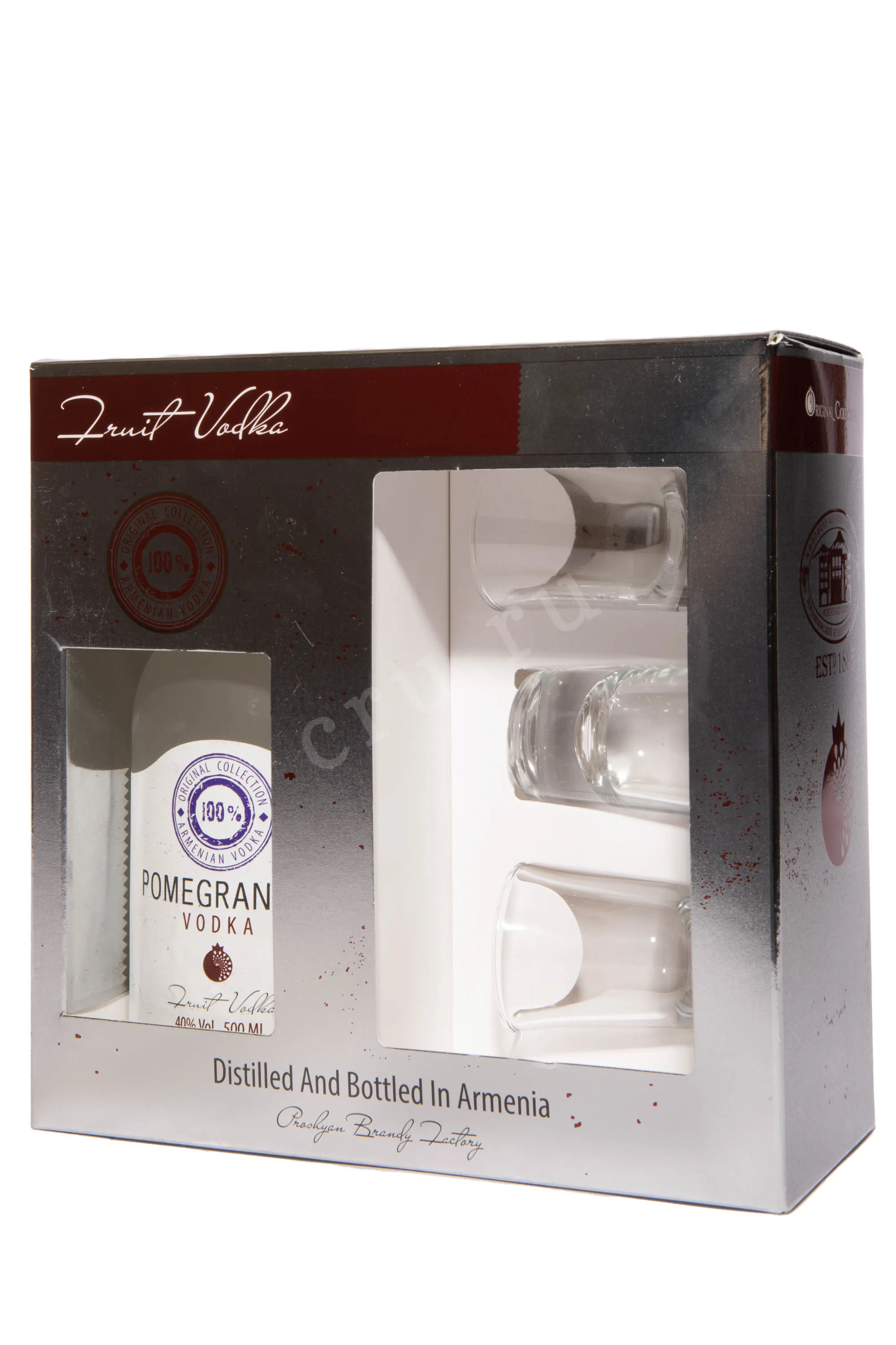 Хент Гранатовая в подарочной упаковке с 3 рюмками 0.5 л купить Водка Hent Pomegranate in gift box with 3 glasses цена в магазине КРЮ ПРОФИ