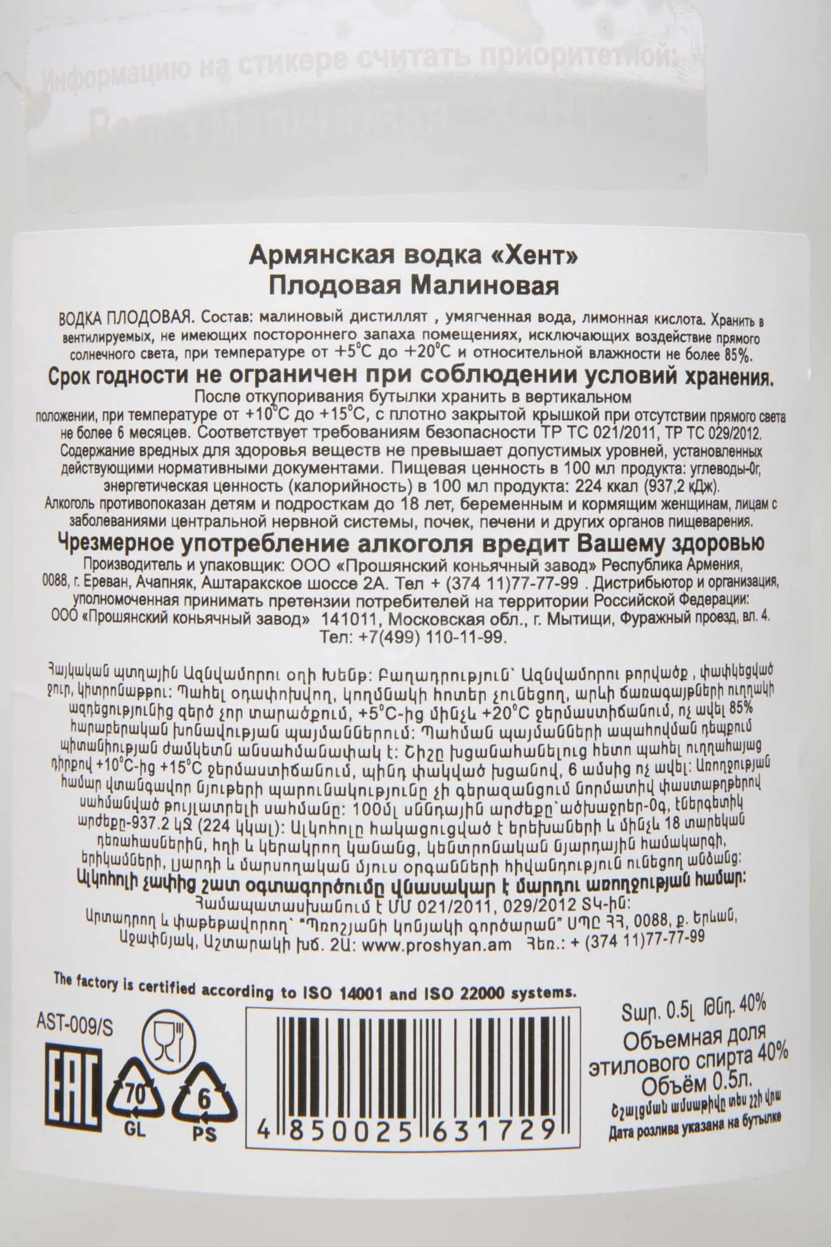 Водка Хент Малиновая 0.5 л производилась исключительно из натурального сырья, полученного в результате перегонки малины. Для её создания использовался малиновый дистиллят, который проходил несколько этапов перегонки и очистки, сохраняя при этом яркий аромат и характер ягод. В процессе выдержки и купажирования удавалось добиться мягкости вкуса и чистоты структуры без добавления ароматизаторов или искусственных примесей. Такой подход позволял создать аутентичный продукт, где в основе лежала только малина, а технология подчеркивала природное богатство этого сырья.