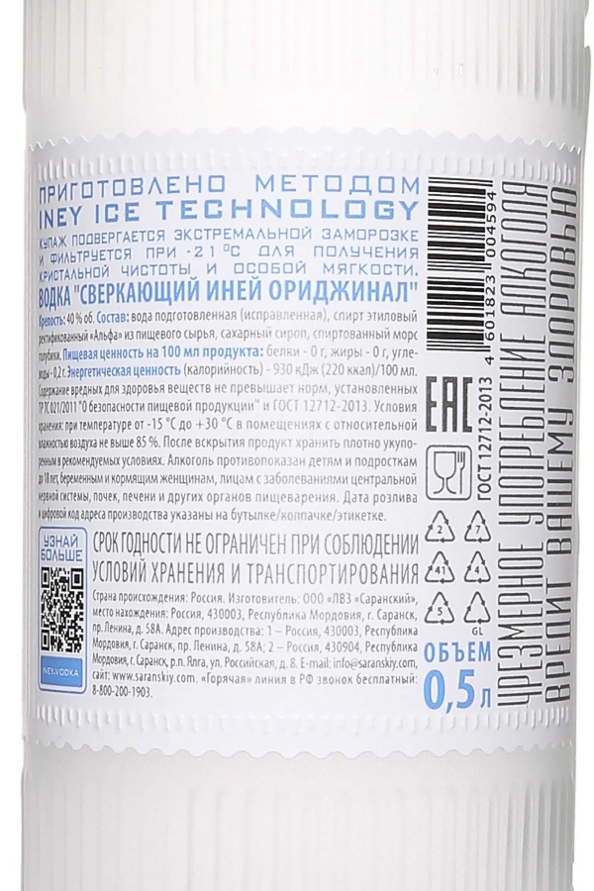 Водка Иней Сверкающий Ориджинал 0,5 л создана в современном стиле, который сочетает традиции и новые технологии. Для производства используются высококачественный спирт класса «Альфа» и тщательно очищенная вода, прошедшая многоступенчатую фильтрацию. Благодаря этому напиток отличается мягким характером и чистым вкусом. Особенность технологии заключается в использовании серебряных фильтров, что придает водке кристальную прозрачность. Бренд подчеркивает свежий, холодный образ напитка, а сама бутылка оформлена в минималистичном стиле с акцентом на чистоту. Водка не раз отмечалась положительными отзывами покупателей за сбалансированный вкус и гармоничное послевкусие.