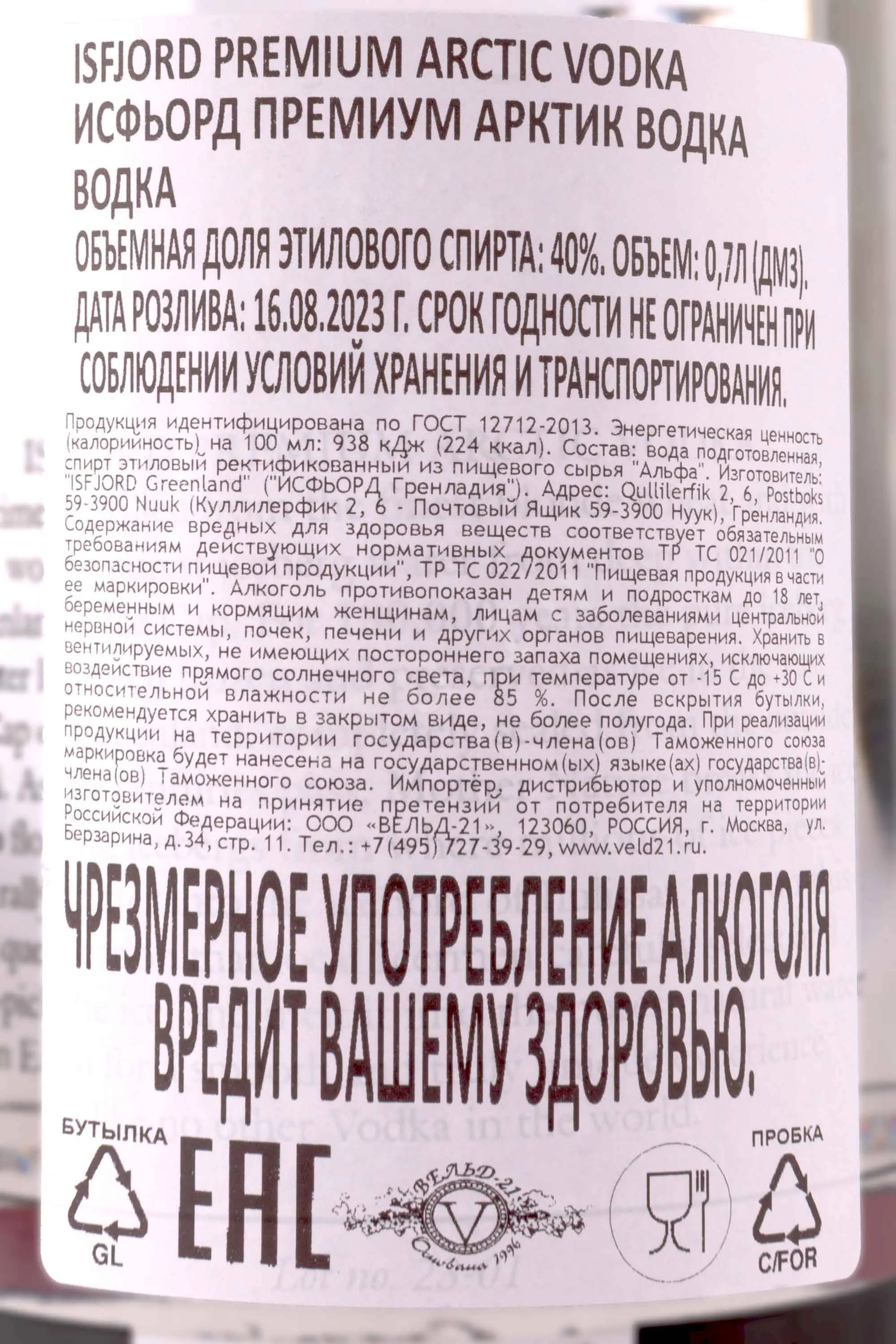 Водка Isfjord Premium Arctic 0,7 л производится в Гренландии одноименной компанией. Для изготовления используют талую воду из айсбергов, добываемых в заливе Диско Бугт. Лед возрастом свыше 180 тысяч лет собирают вручную местные жители. После естественного таяния в течение нескольких недель вода проходит дополнительную фильтрацию для исключительной чистоты. Спирт получают из высококачественной пшеницы путём пятикратной перегонки и смешивают с ледниковой водой. Уникальность напитка состоит в сочетании ледниковой воды и качественного зернового спирта, благодаря чему водка имеет особый, мягкий вкус.