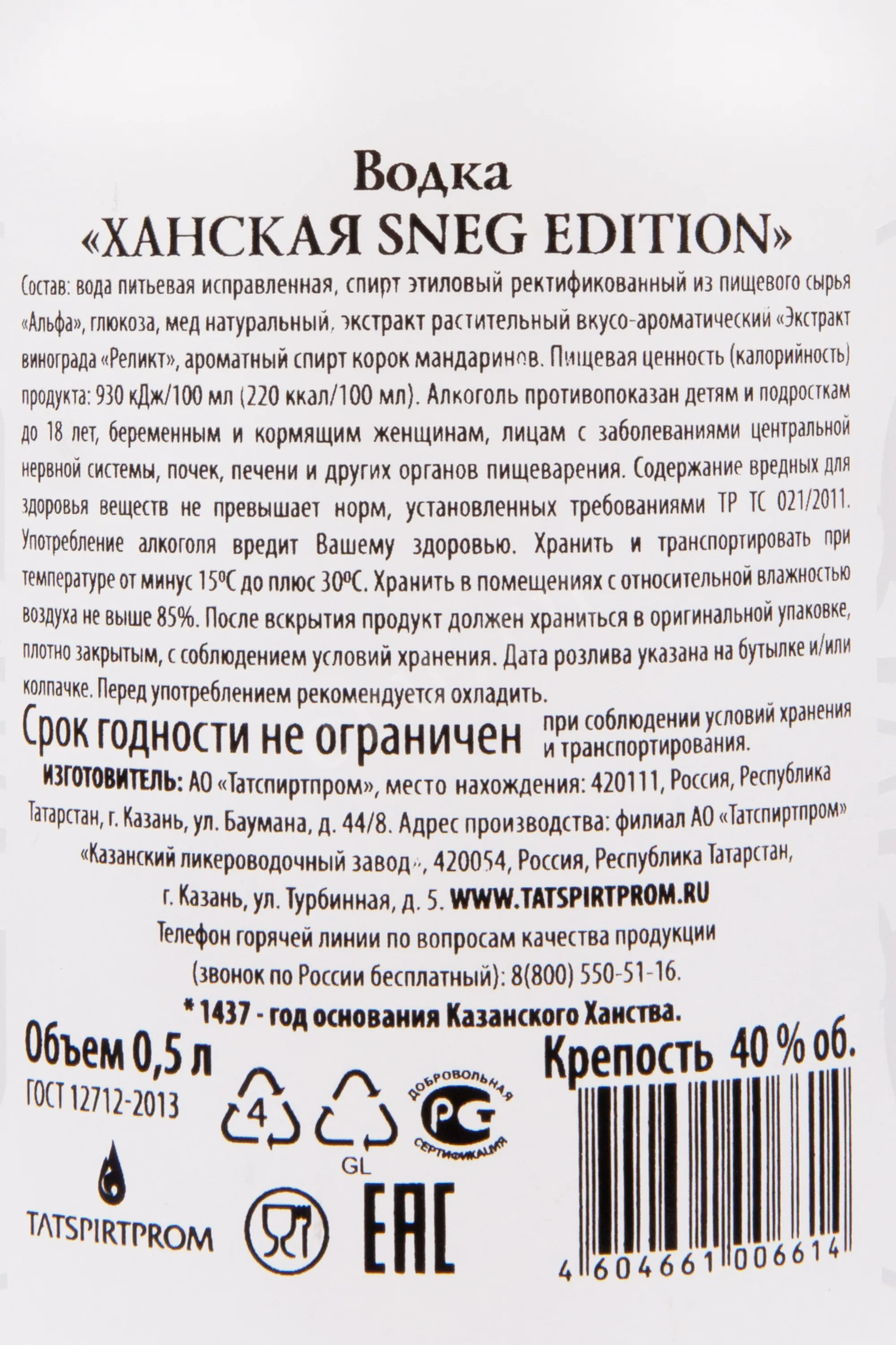 Водка Khanskaya Sneg Edition 0.5 l – это российский алкоголь премиального сегмента от компании ОАО «Татспиртпром», созданный на основе ректификованного спирта категории «Альфа». Уникальные органолептические качества 40-процентного напитка достигаются путем добавления медового и виноградного экстрактов и настоя мандариновых корок. При этом название данный релиз получил благодаря талой воде, с помощью которой получают нужную крепость водки. Готовый алкоголь разливается в бутылки объемом 500 мл с брендовой этикеткой, на которой указан год образования Казанского ханства.