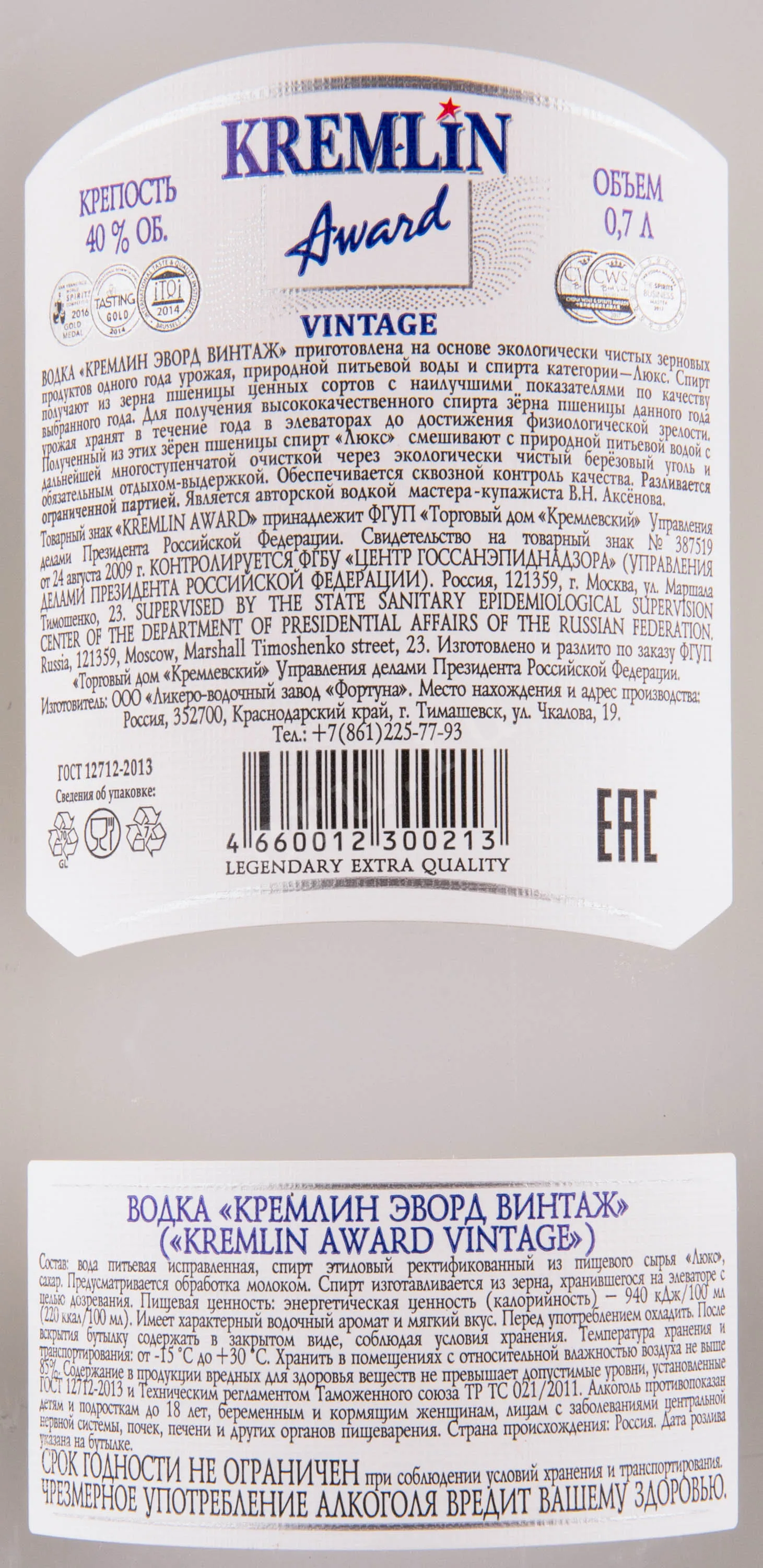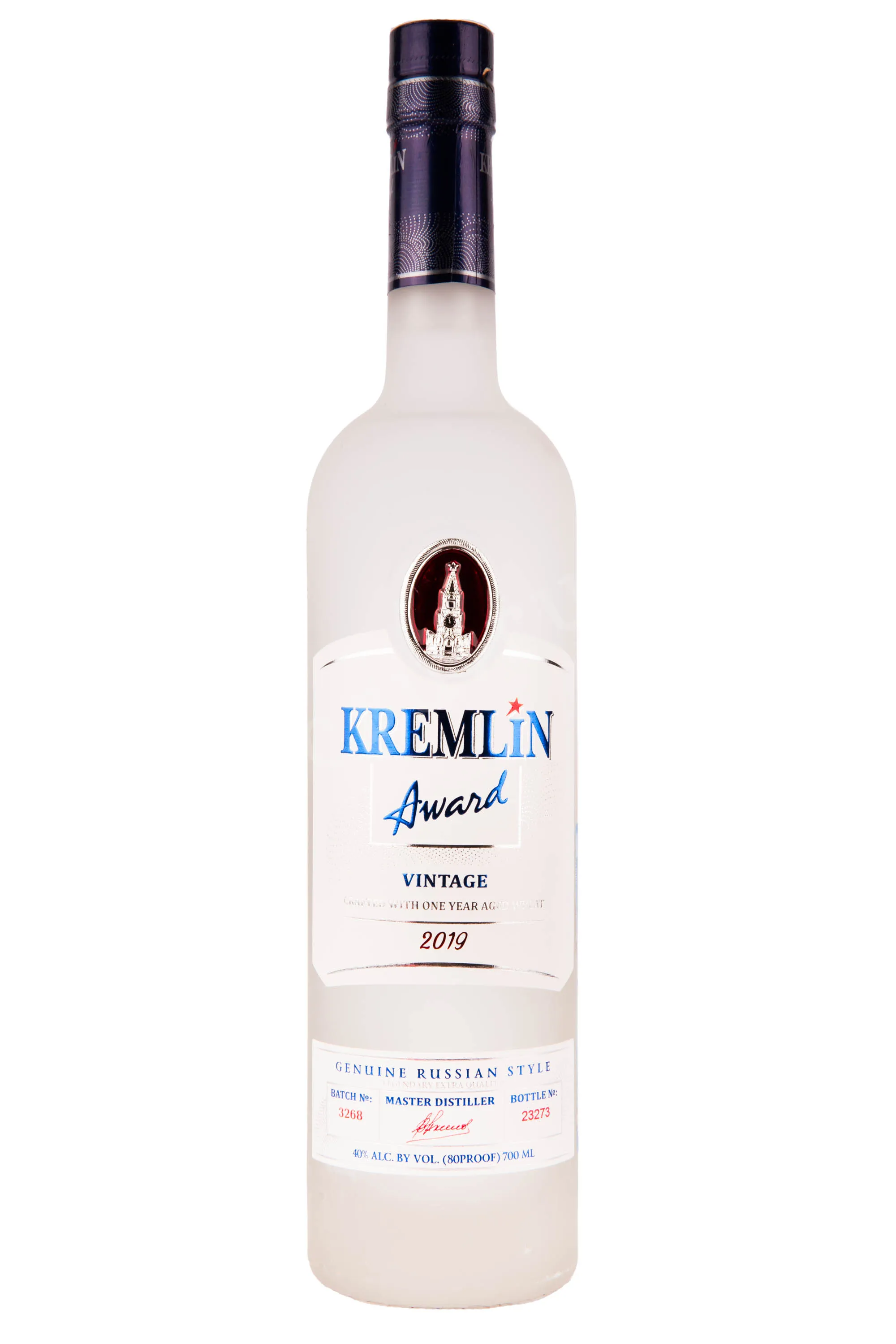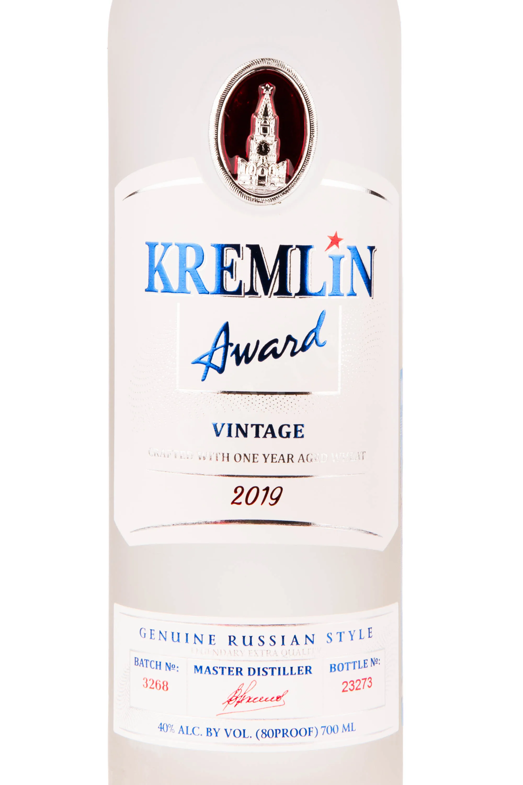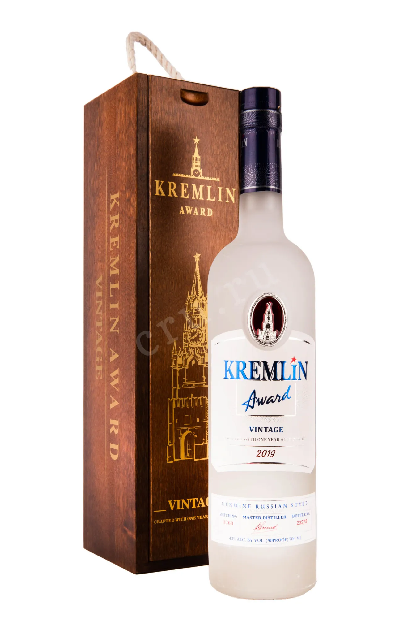 Водка Kremlin Award Vintage 2019 wooden box 0.7 l – это элитный винтажный российский алкоголь, выпускаемый ликеро-водочным заводом Фортуна. Напиток изготовлен на основе экологически чистой пшеницы ценных сортов урожая одного года. После сбора зерна хранятся примерно в течение 12 месяцев в специальных помещениях до полного вызревания. Затем сырье сбраживают и перегоняют, а полученный дистиллят купажируют с исправленной питьевой водой для достижения крепости 40%. Перед бутилированием напиток подвергается угольной фильтрации с последующей выдержкой в течение нескольких месяцев. Выпускается винтажная водка в сосудах, каждый из которых имеет индивидуальный номер. В комплекте прилагается подарочный бокс из натурального дерева.