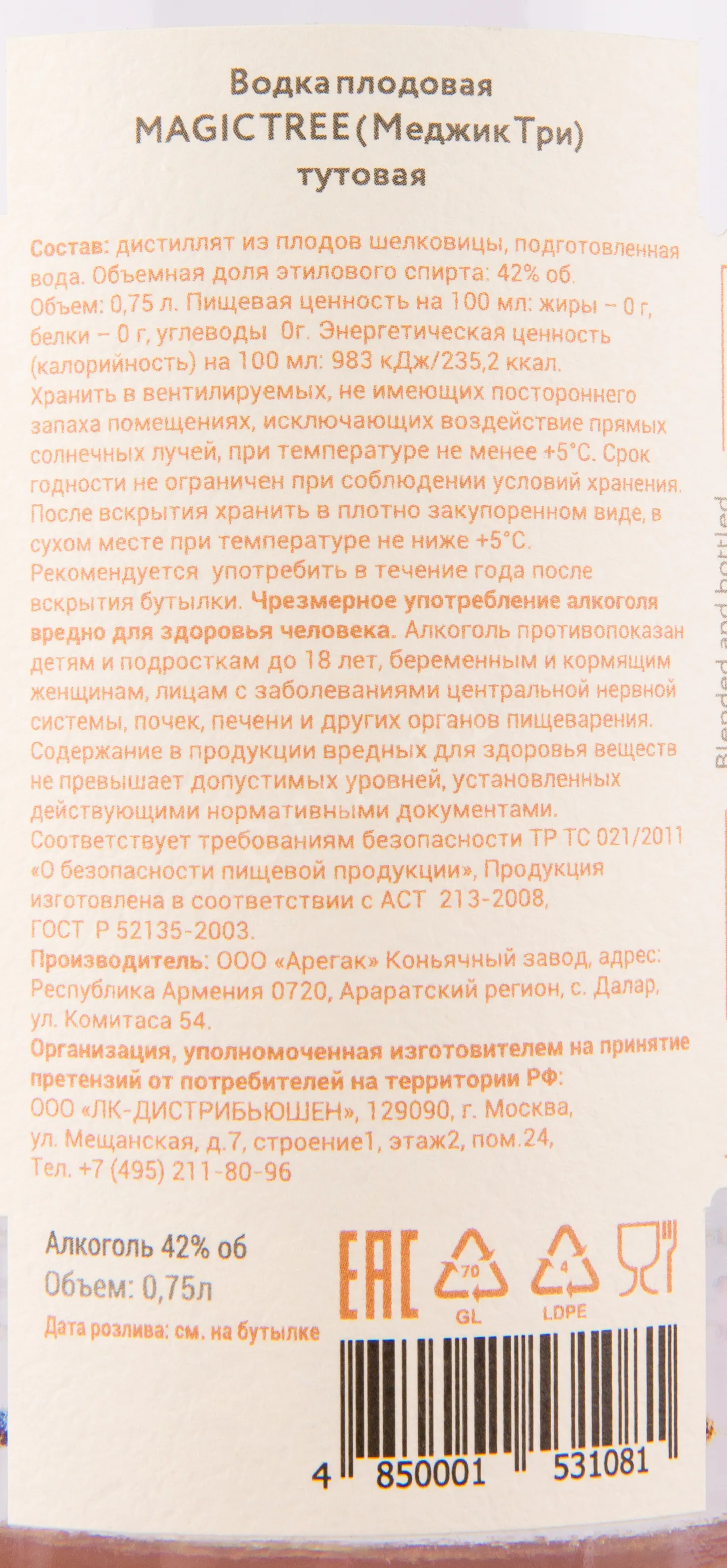 Водка Magic Tree Mulberry 0.75 l – это премиальный органический алкоголь, выпускаемый армянской компанией Арегак. Основой напитка являются плоды тутового дерева, из которых методом двойной перегонки получают ароматные спирты. Дистилляты выдерживают в коньячных дубовых бочках, после чего смешивают с природной водой из горных источников до крепости 42%. Готовая водка была разлита в сосуды из прозрачного стекла объемом 750 мл. Данный релиз был отмечен серебряной медалью на всемирном конкурсе спиртных напитков в Сан-Франциско.