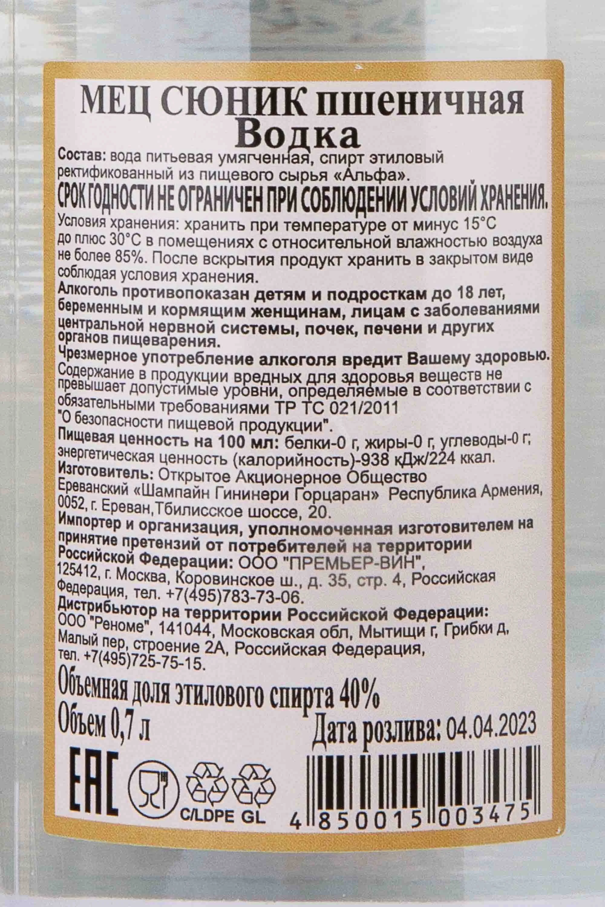 Водка Мец Сюник Пшеничная 0,7 л производится в Армении на Ереванском заводе шампанских вин. Для её изготовления используют спирт высшей категории «Альфа» из отборной пшеницы и умягчённую питьевую воду. Благодаря сочетанию высококачественного сырья и традиционных технологий, напиток приобретает мягкий и гармоничный вкус. Объем 0,7 л является универсальным выбором для любых случаев.