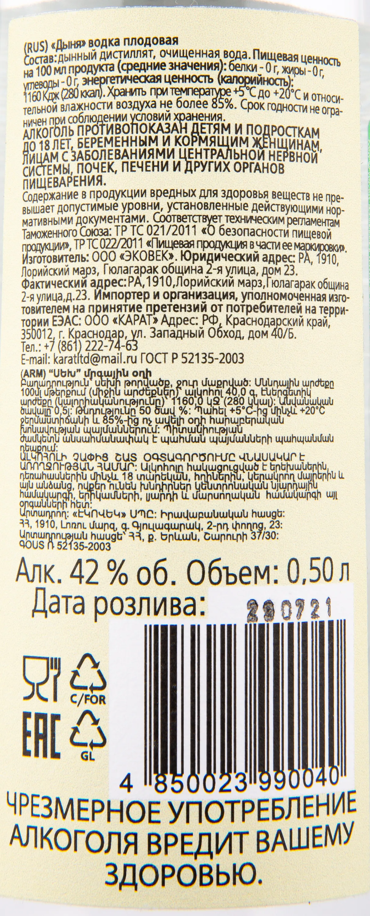 Водка Morus Melon Armavir 0.5 l – это фруктовый алкоголь от армянского производителя, созданный на основе дынного дистиллята и смягченной воды. Спелые плоды дыни выращивают в Араратской долине и собирают только ручным способом. После сортировки сырье отправляют под пресс, а полученный сок сбраживают и перегоняют. Затем спирт смешивают с водой для достижения крепости 42%. Готовая водка была бутилирована в июле 2021 года.