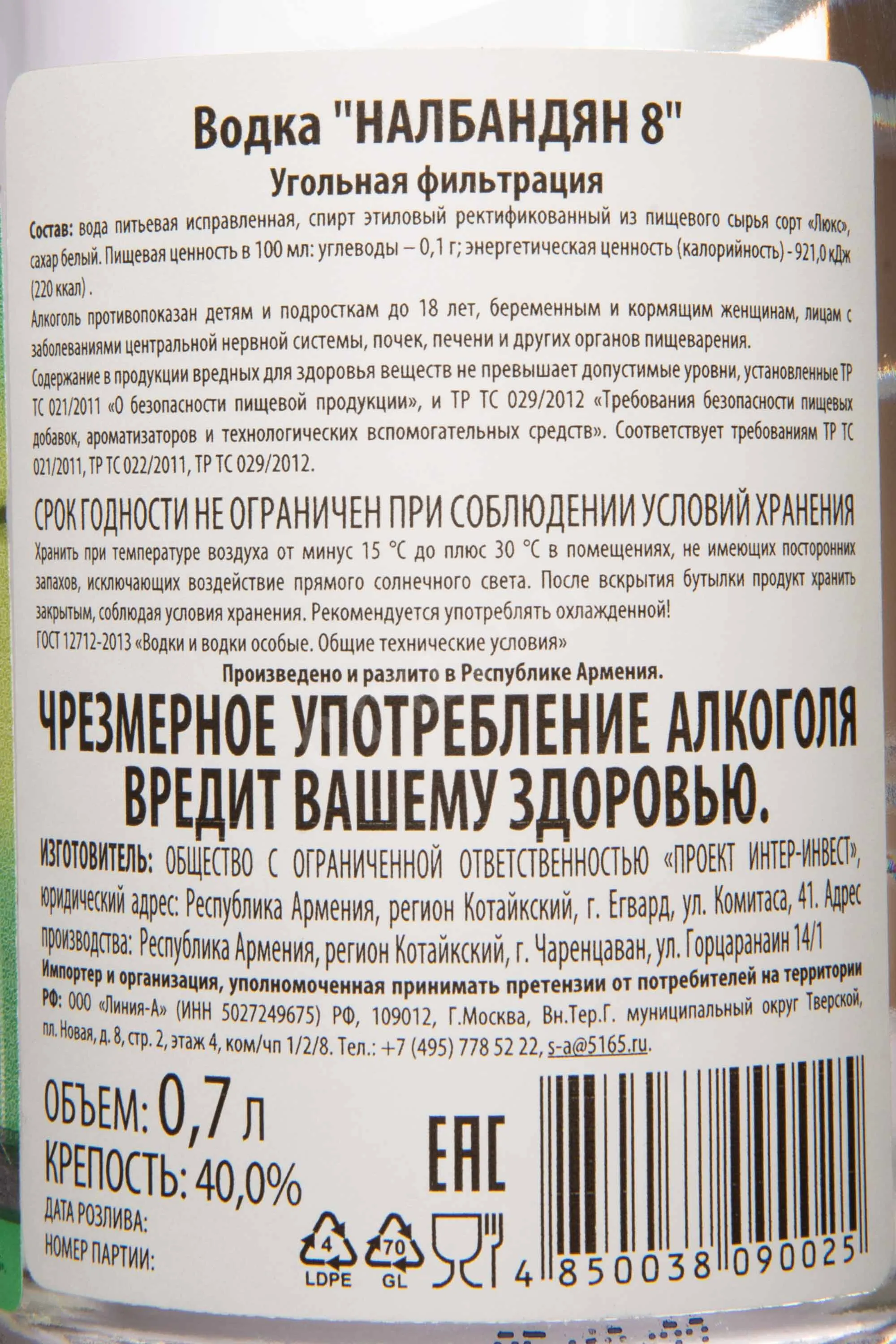 Водка Nalbandyan 8 0,7 л — это армянский спиртной напиток премиум-класса, созданный из качественного зернового спирта. Особенность производства — применение технологии многоступенчатой фильтрации, в том числе с использованием платины. Это позволяет добиться безупречной чистоты и сбалансированной мягкости напитка. Объём бутылки 0,7 литра — это традиционный, наиболее удобный формат, что делает эту водку универсальным вариантом для праздничного застолья и подарка.