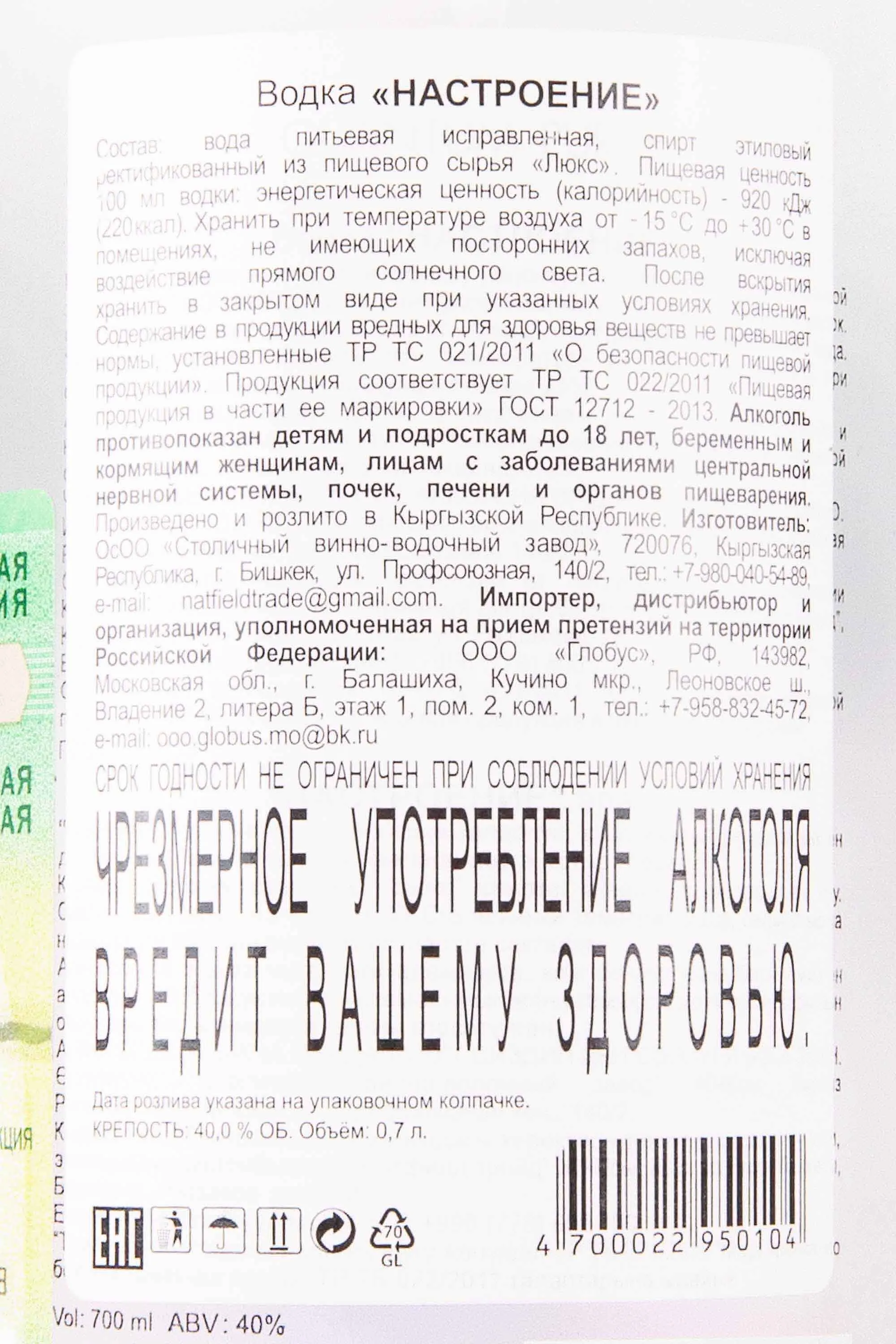 Водка Настроение 0,7 л производится на заводе города Бишкек. В основе напитка лежит высококачественный спирт класса «Люкс», полученный из отборной пшеницы с полей Чуйской долины. Особенность производства состоит в использовании артезианской воды, добываемой с глубины более 180 метров, и многоступенчатой очистке. Благодаря этому напиток отличается исключительной мягкостью и чистотой. Водка удостоена международных наград и признана одной из лучших в своей категории.