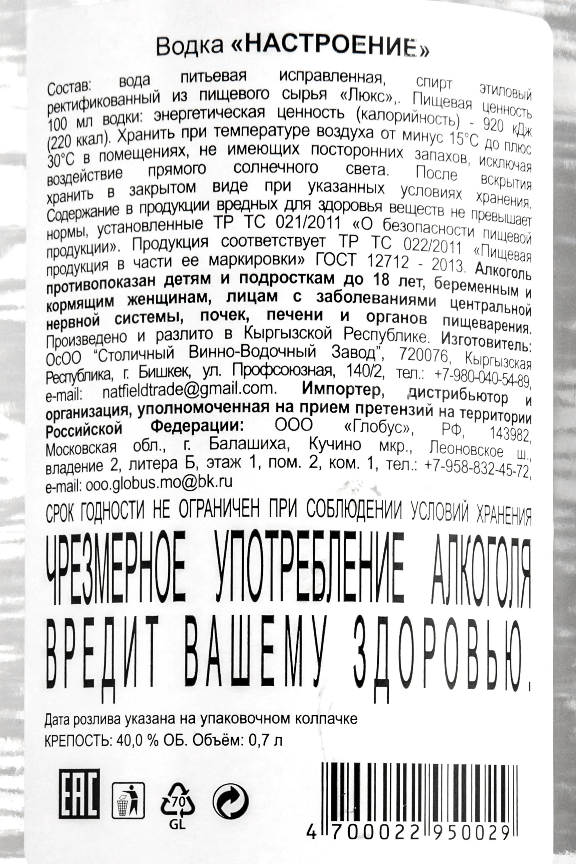 Водка Настроение V 0,7 л создается на основе зернового спирта категории «Люкс». При изготовлении используется чистейшая природная вода, благодаря чему напиток приобретает особенную мягкость. Отличительной чертой является технология фильтрации, которая включает 11 этапов. Натуральные компоненты и строгий контроль качества делают водку премиальной по своему характеру.