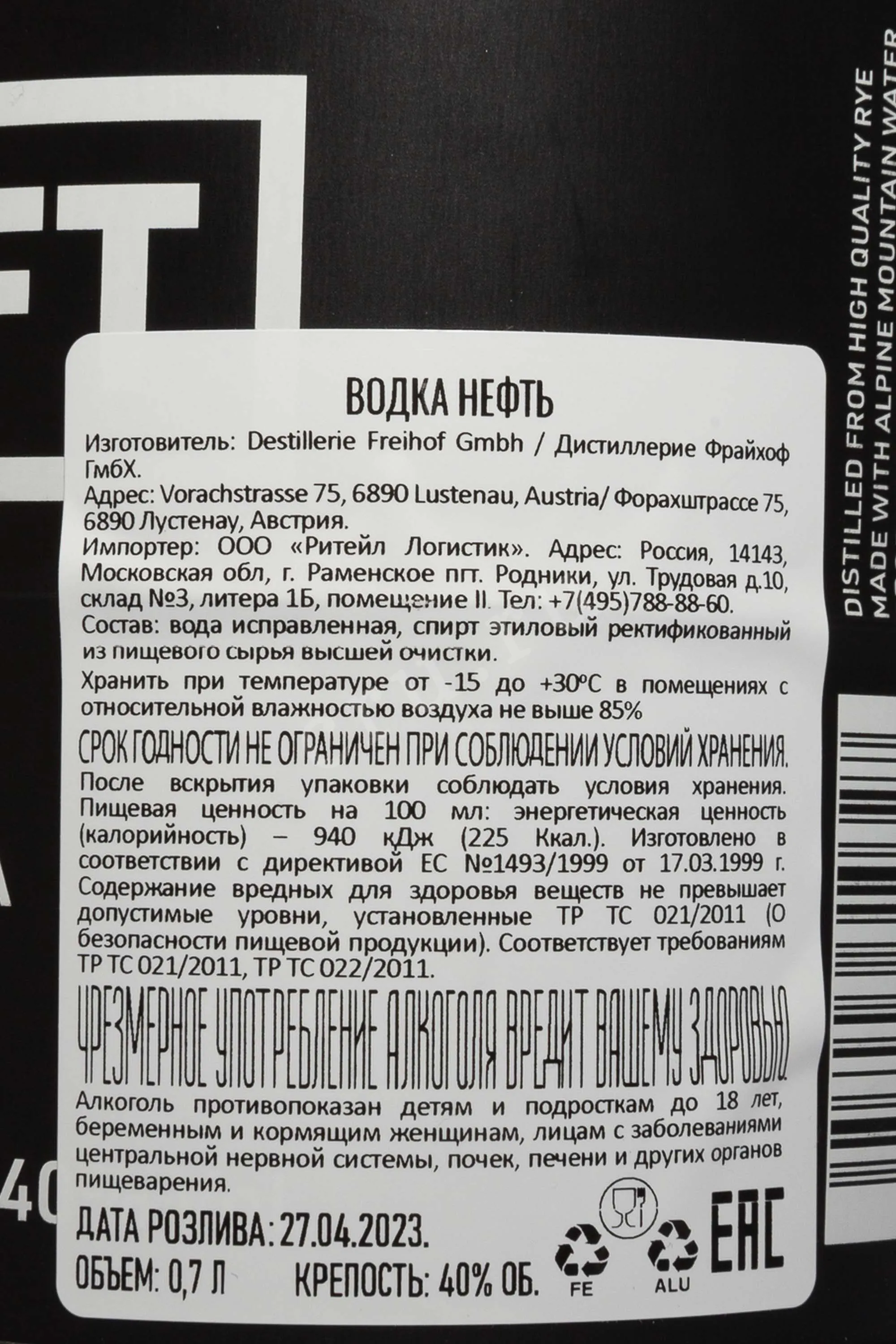 Водка Нефть чёрная в металлической бочке 0,7 л — премиальный крепкий напиток, известный сочетанием лаконичного состава и нестандартной упаковки. Водка производится в Австрии из отборной ржи, выращенной в локальных сельскохозяйственных зонах. В производстве используется природная вода альпийского происхождения, отличающаяся низкой минерализацией. Спирт получили путём многократной перегонки. Рецептура не предусматривает добавления сахара, ароматизаторов или иных корректирующих компонентов. Ёмкость служит функциональной и защитной упаковкой, не влияющей на органолептику, и подчёркивает индустриальный характер бренда.