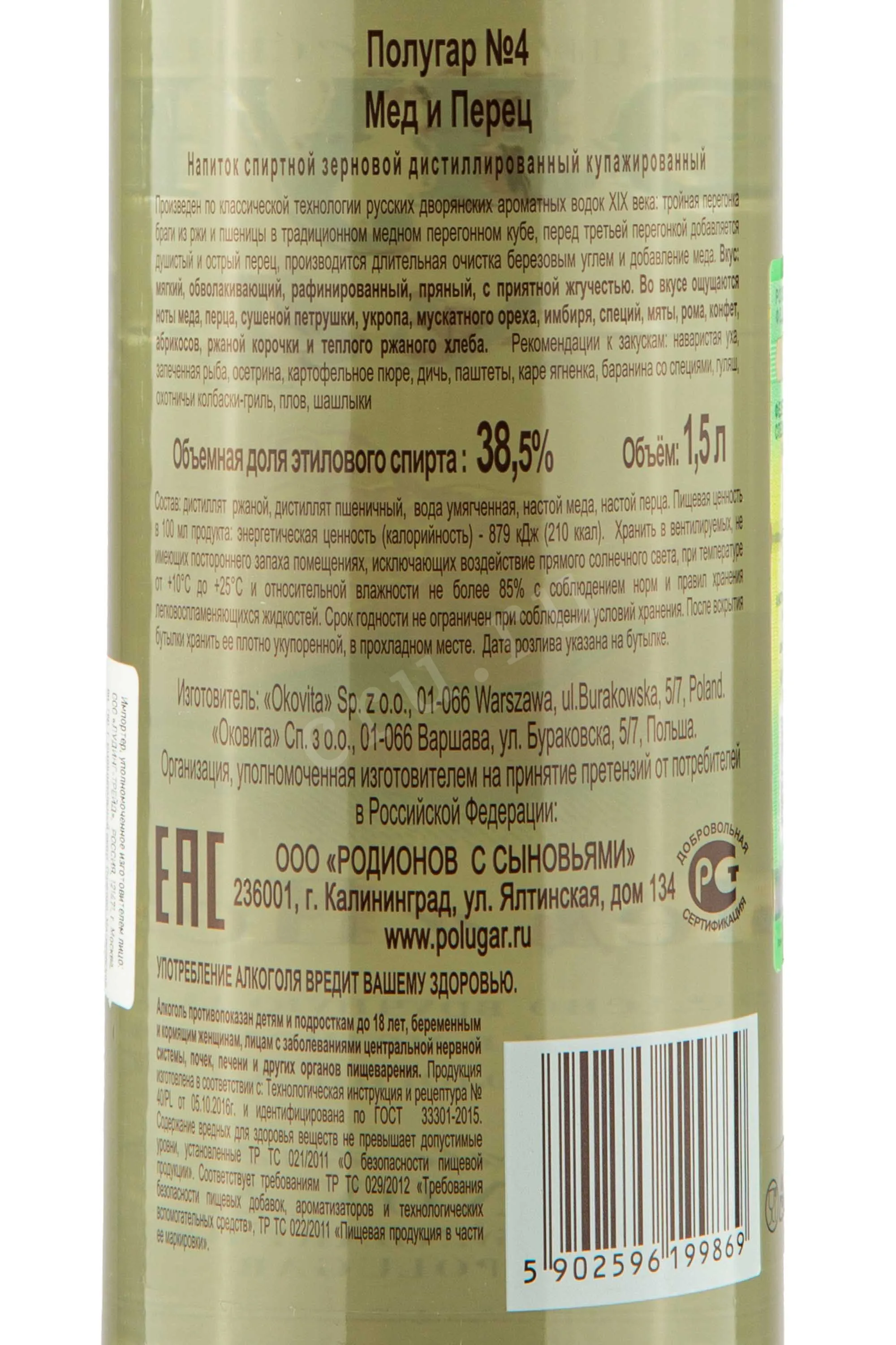 Полугар №4 (Мёд и Перец) 1.5 л купить Водка Polugar №4, Honey & Allspice цена в магазине КРЮ ПРОФИ