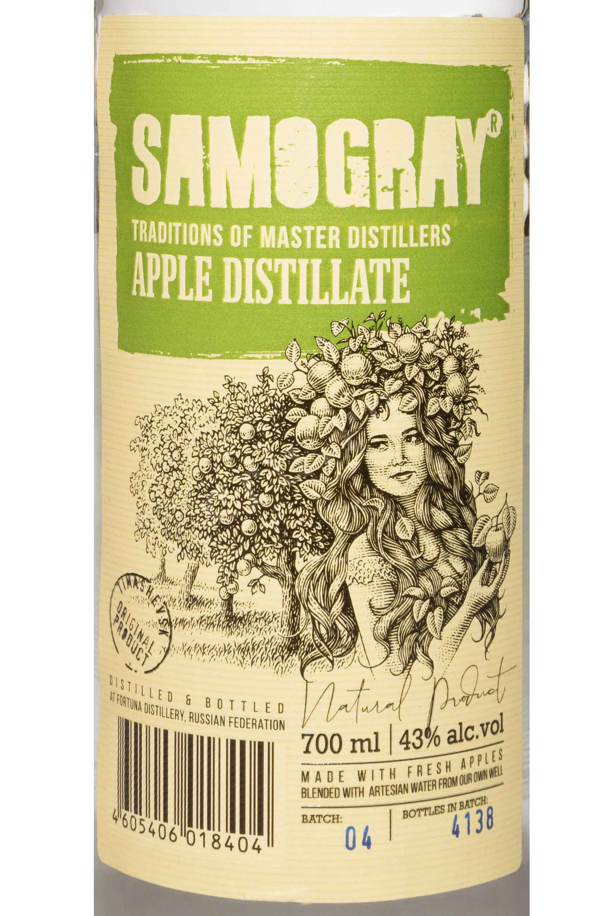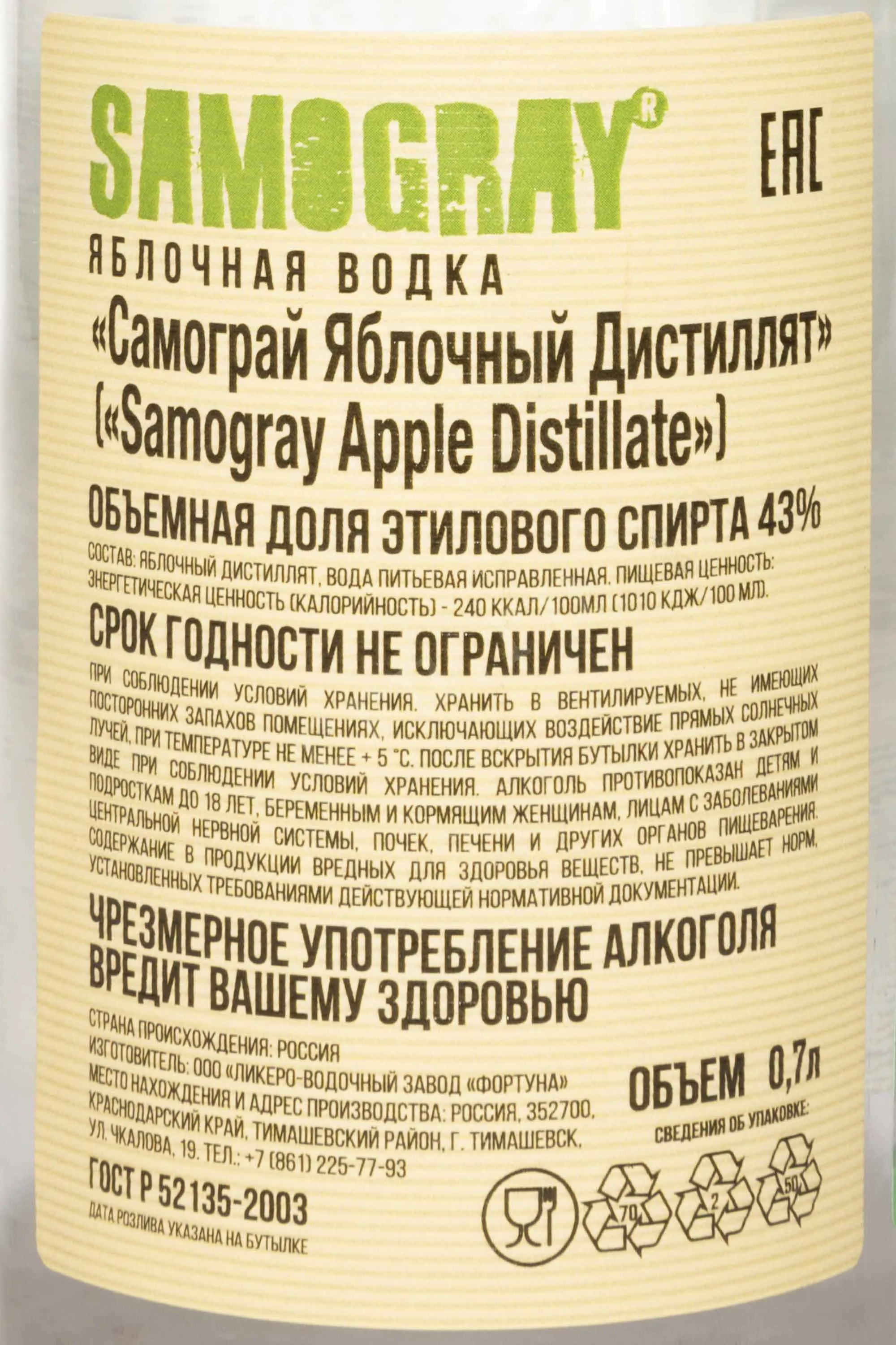 Водка Самограй Яблочный 0.7 л производится из натурального яблочного сырья. Напиток выполнен в собственном стиле и отличается мягким характером с выраженными естественными фруктовыми нотами.. Для производства используют сорта яблок Семеренко и Голден. Урожай собирают вручную, что позволяет сохранить качество плодов. Их перерабатывают в течение нескольких недель. Полученный дистиллят проходит многоступенчатую фильтрацию. Такой подход делает вкус чище и мягче. Особенность водки — использование исключительно яблочного сырья без зерновых спиртов.