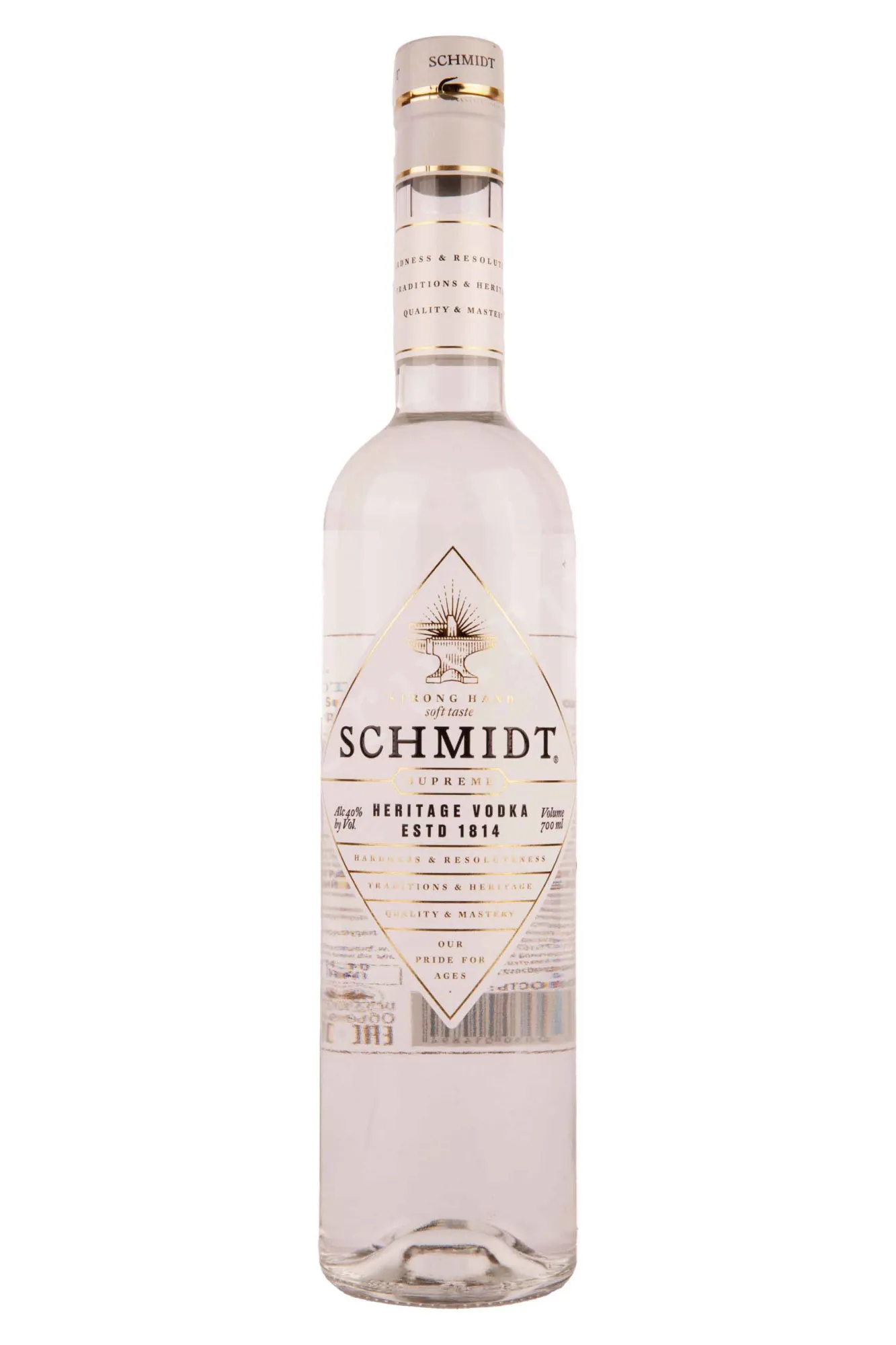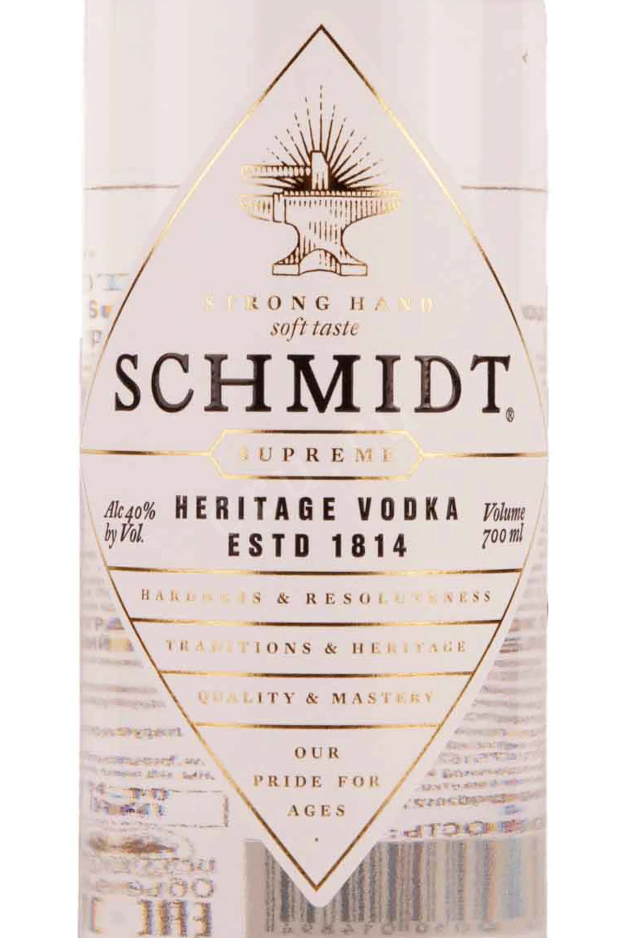 Водка Schmidt Supreme 0.7 l – это высококачественный белорусский алкоголь, выпуском которого занимается ликеро-водочный завод БелАлко. 40-процентный напиток изготавливается на базе ректификованного спирта категории «Люкс» из тритикале (гибрида пшеницы и ржи). Нужная крепость достигается методом смешивания дистиллята с природной водой из собственной скважины компании. Благодаря угольной и жемчужной фильтрации, водка очищается от ненужного осадка и обретает необычайно мягкий вкус. Готовый алкоголь представлен в классическом сосуде из прозрачного стекла объемом 700 мл.