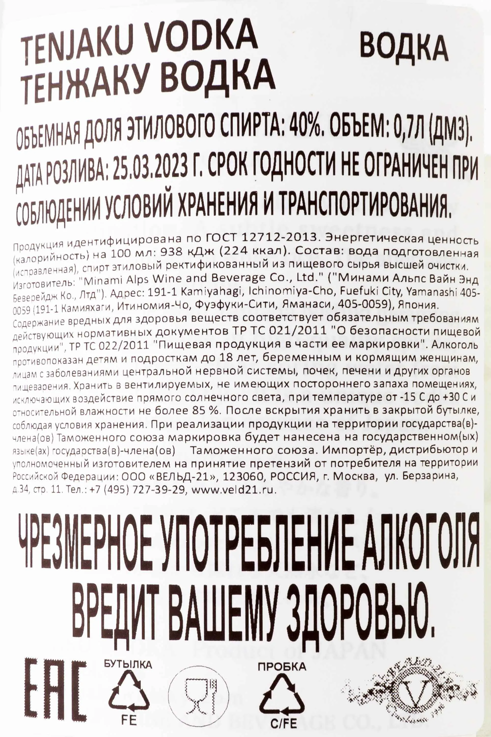 Водка Tenjaku 0,7 л — 40-процентный алкоголь премиального качества, выпуск которого осуществляет предприятие Minami Alps Wine and Beverages. Процессы производства подчиняются требованиям современного сертификата FSSC 22000, гарантирующего соответствие строгим стандартам международной алкогольной индустрии. Основой напитка традиционной сорокапроцентной крепости служит рис сорта Ямада Нисики, дополненный чистейшей водой из артезианского источника близ горы Фудзи. После перегонки водка подвергается многоступенчатой фильтрации через установки из угля бамбука и березы.