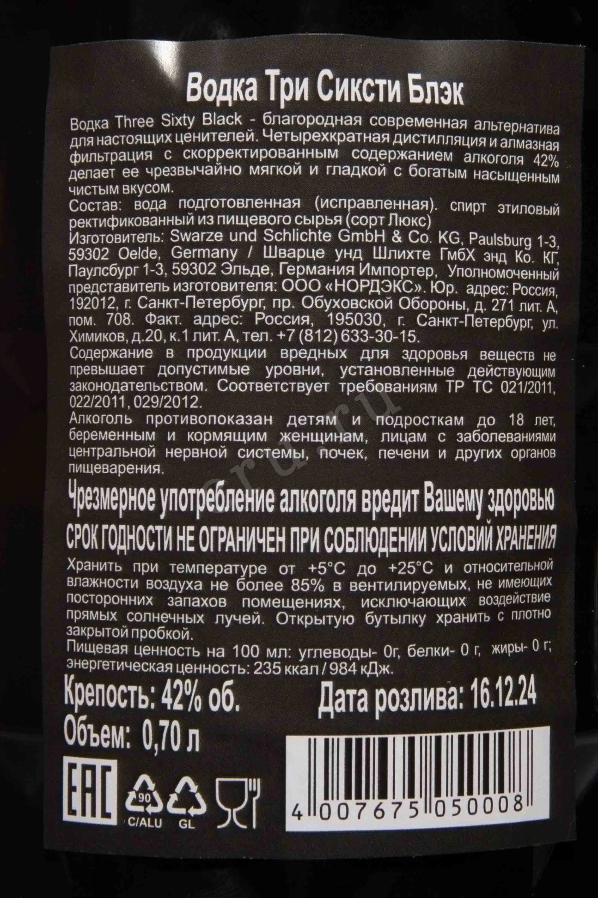 Водка Three Sixty Black 42 0,7 л – уникальный премиум-сорт крепкого спиртного, в котором слились воедино высокие стандарты немецкой алкогольной промышленности и стильный, привлекающий внимание дизайн. Отборные спирты прошли четырехкратную дистилляцию и были очищены с помощью инновационных алмазных фильтров, позволивших удалить из жидкости мельчайшие взвешенные частицы размером до тысячной доли миллиметра. Образец разлит при крепости 42% – это на 4,5% больше, чем в базовой версии Original. Эффектная граненая бутылка непроницаемого черного цвета с приятной на ощупь этикеткой из настоящего бархата станет звездой ассортимента напитков в любом баре и на полке шкафа с алкоголем у вас дома.
