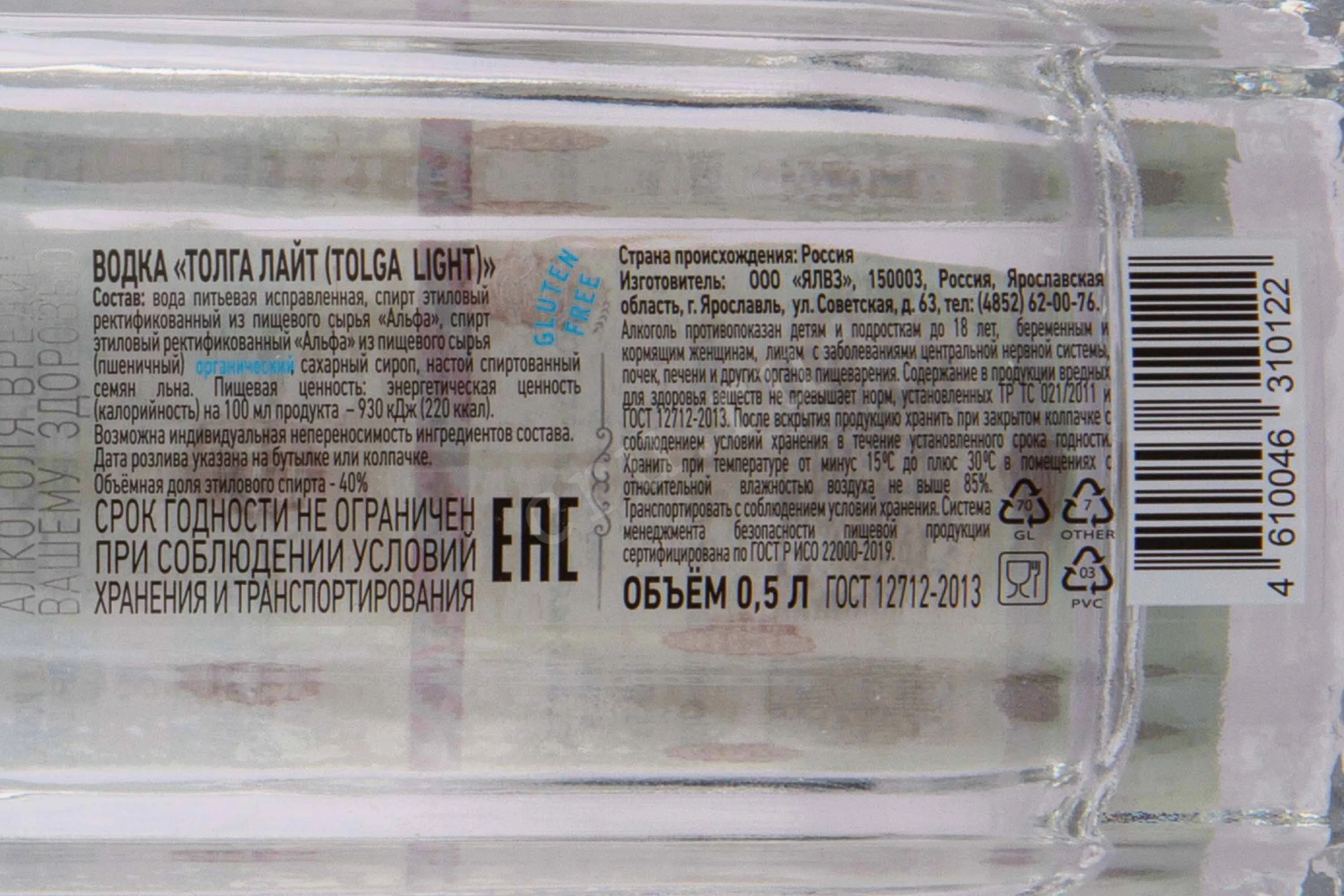Водка Tolga Light 0.5 l – это оригинальный органический российский алкоголь от Ярославского ликеро-водочного завода. Основой напитка является ректификованный спирт категории «Альфа» из отборного зернового сырья. Дистиллят купажируют с исправленной питьевой водой из природных источников до крепости 40%, а после смешивают с сахарным сиропом и настоем семян льна. Перед розливом напиток подвергается очистке с помощью угольных фильтров. Выпускается водка лимитированными партиями в граненых бутылках объемом 500 мл.