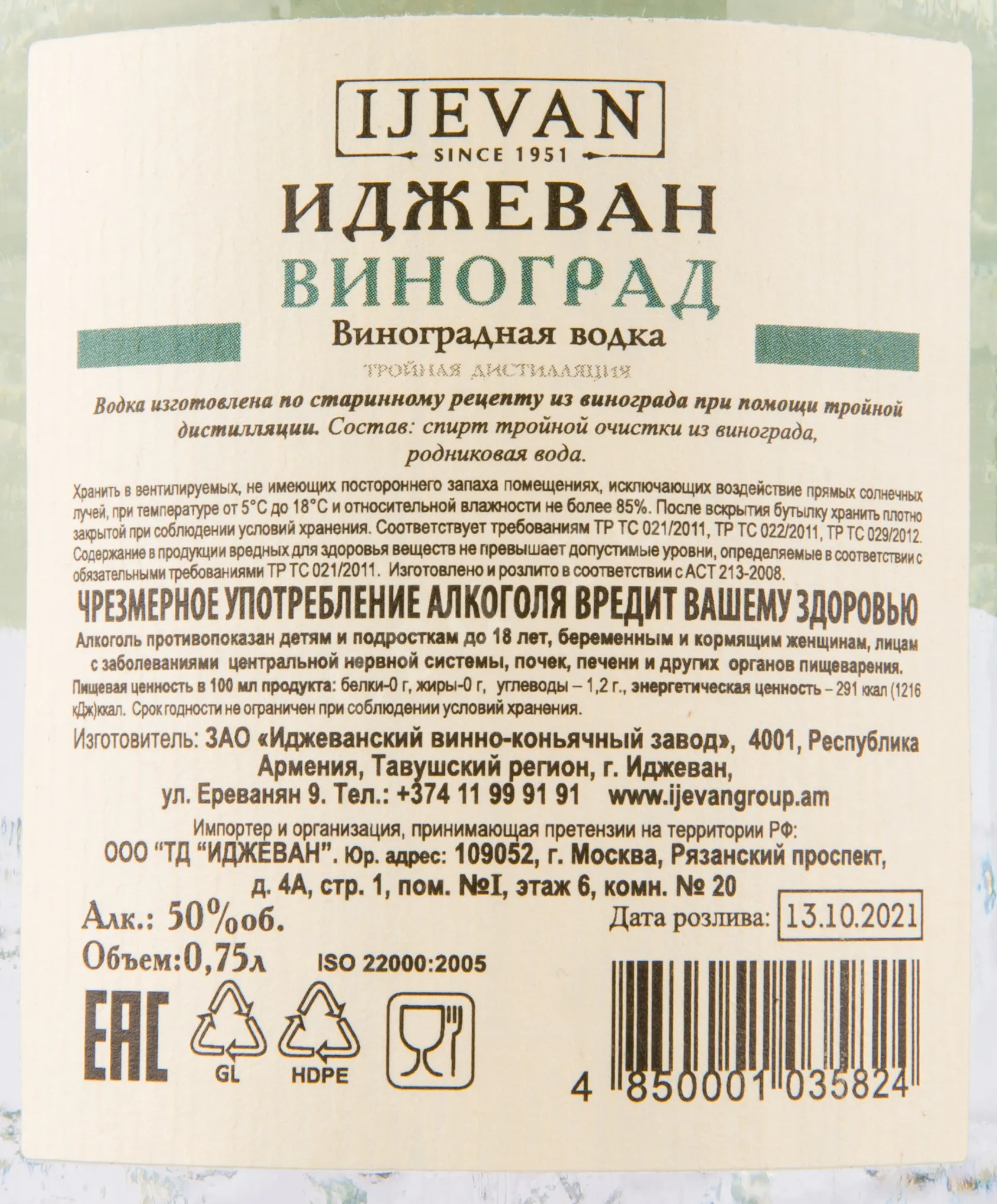 Иджеван Виноград 0.75 л купить Водка Ijevan Grape цена в магазине КРЮ ПРОФИ