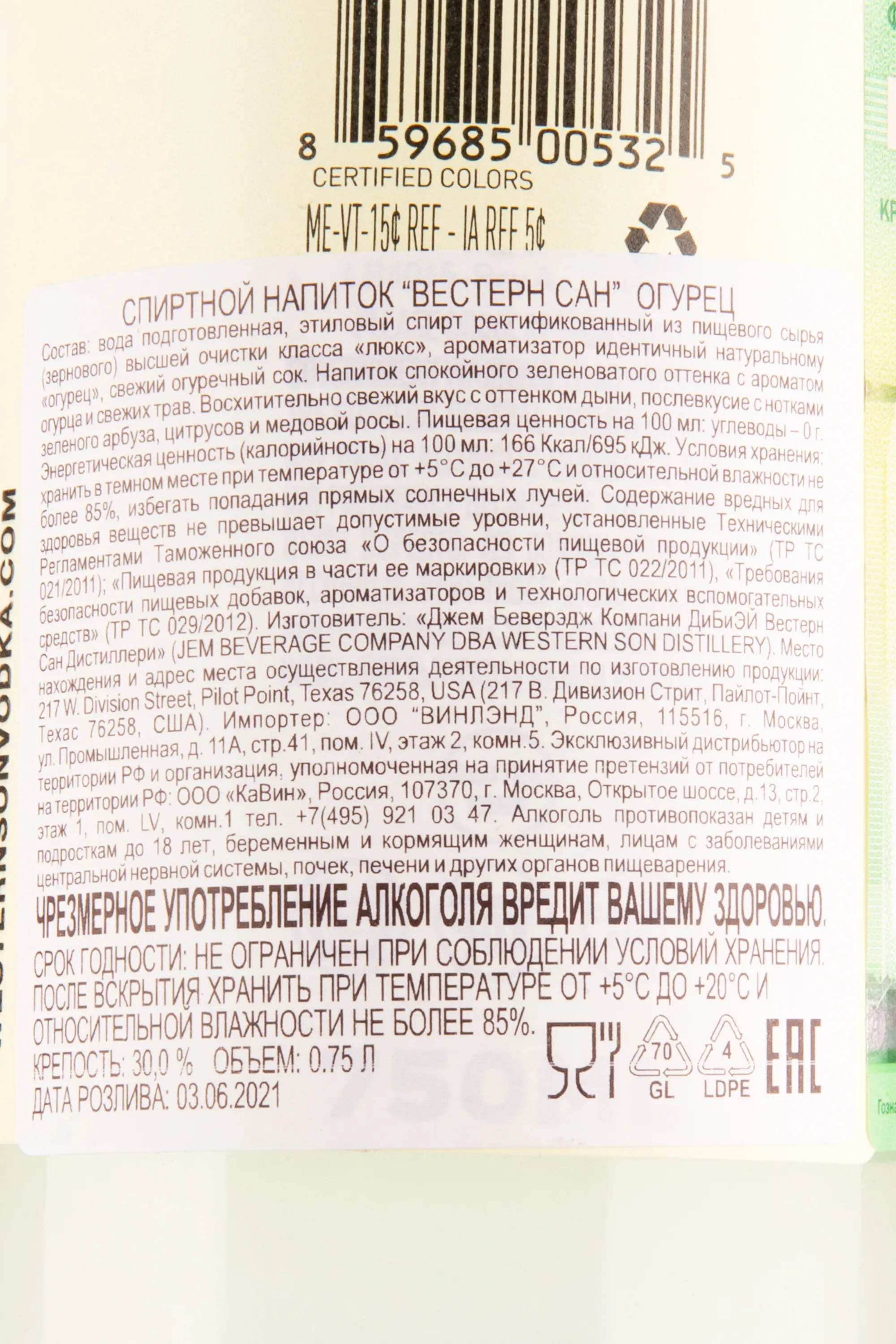 Водка Western Son Cucumber 0.75 l – это оригинальный американский алкоголь, основой которого является ректификованный люксовый спирт высшей степени очистки. Также в составе 30-процентного напитка имеется свежий огуречный сок и ароматизатор растительного происхождения. Изготавливается премиальный напиток методом десятикратной перегонки с последующей фильтрацией через природные минералы. Готовая водка была разлита по сосудам объемом 750 мл в июне 2021 года. Спиртное было отмечено двойной золотой медалью на дегустационном конкурсе в США.