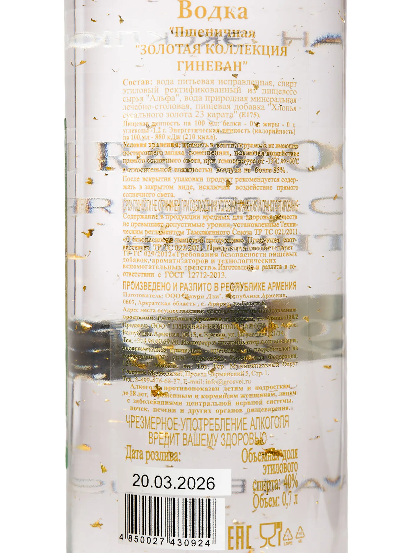 Водка Гиневан Пшеничная Золотая Коллекция 999.9 0.7 л отличается премиальным качеством, что подчеркивает соответствующее оформление. Лаконичный дизайн бутылки с металлическим напылением сразу привлекает внимание. Производство основано на сочетании вековых традиций и современных технологий. В качестве сырья используется зерно пшеницы, выращенной в экологически чистых регионах Армении. Водка разбавляется природной минеральной лечебно-столовой водой, что придает вкусу мягкость и особенные оттенки. Напиток также обогащен хлопьями сусального золота 32 карата, что делает его визуально эффектным. Его стоит выбрать для подарка или праздника.