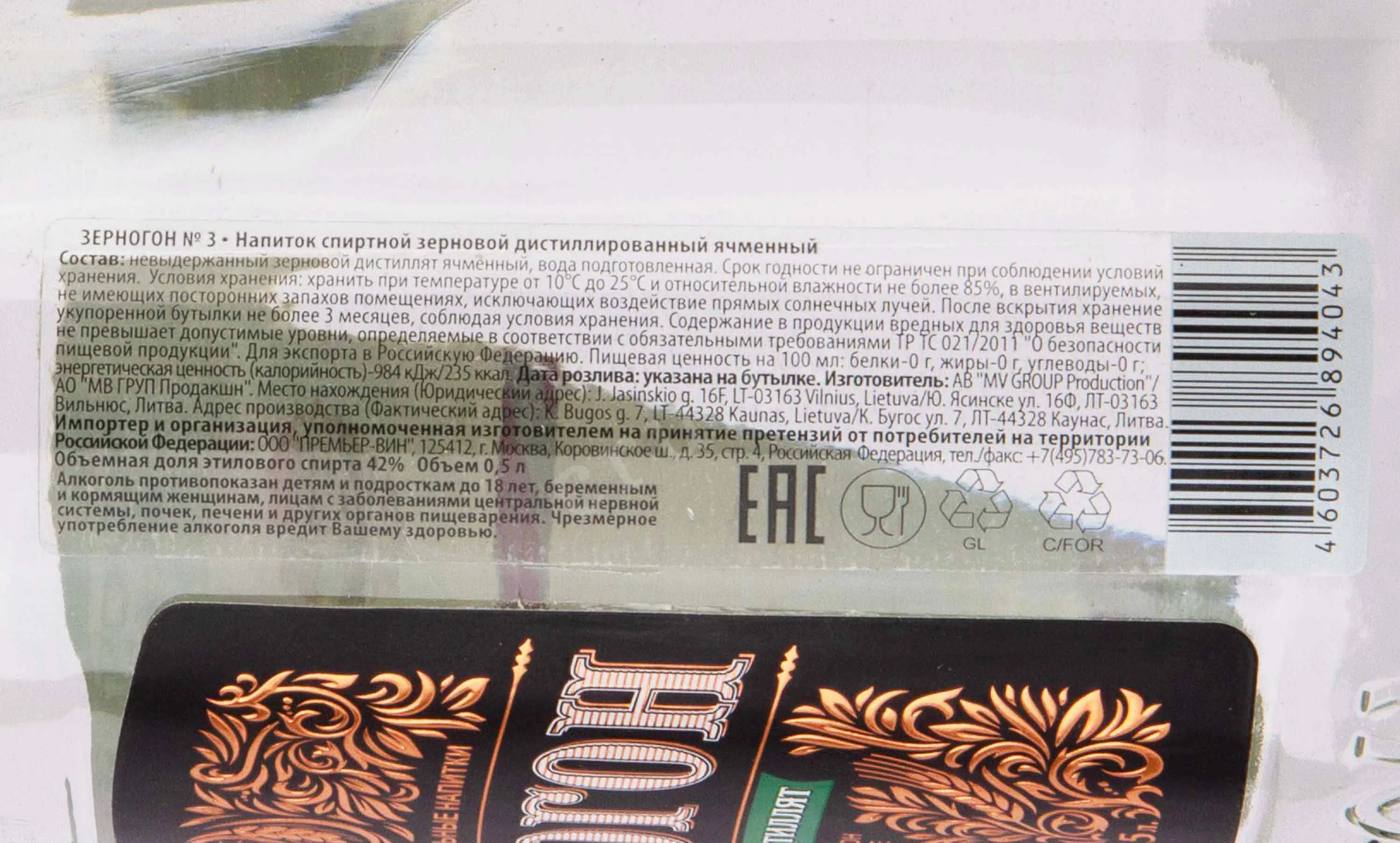 Водка Зерногон №3 0,5 л производится по оригинальной технологии. Сырьем служит отборный ячмень, который превращают в солод путем сбраживания. Дистилляция проходит в два этапа: сначала в медных кубах, затем повторная перегонка с использованием многофракционной методике. Полученные спирты купажируют, создавая напиток с крепостью 42%. Этот способ приближает процесс к изготовлению виски, придавая водке уникальный характер. Рекомендуется употреблять напиток не охлажденным, чтобы полностью раскрыть его вкусовые качества.