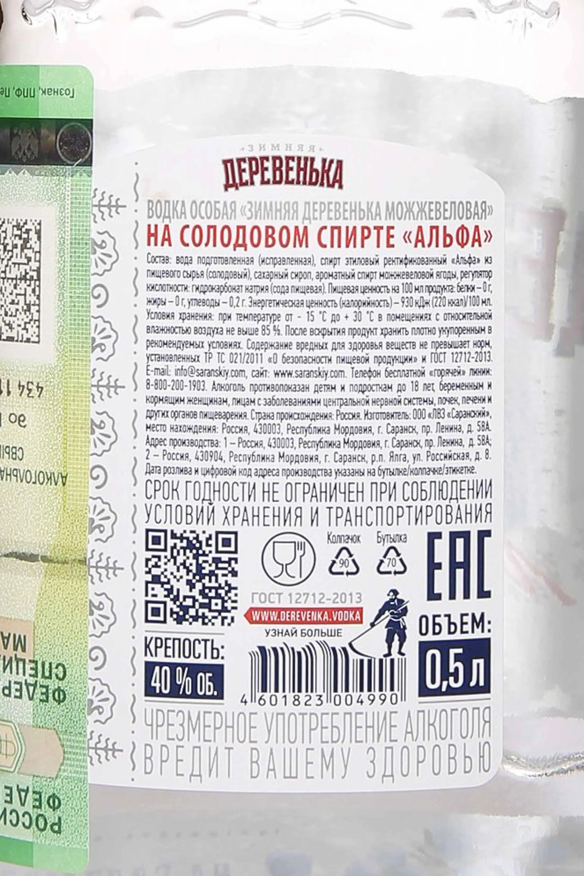 Водка особая Зимняя Деревенька Можжевеловая 0,5 л создана в традиционном русском стиле, сочетающем качество и национальные мотивы. Основной является солодовый спирт «Альфа», полученный путем натурального брожения. В роли сырья использовались зерно высшего сорта и солод с собственной солодовни производителя. Такой подход обеспечил напитку мягкий вкус с хлебными оттенками и естественный аромат. В водку был добавлен натуральный ароматный спирт можжевеловой ягоды, что сделало ее уникальной. Бутылка привлекает внимание дизайнерским оформлением с рельефными узорами в стиле мезенской росписи. Пробка снабжена системой контроля вскрытия.