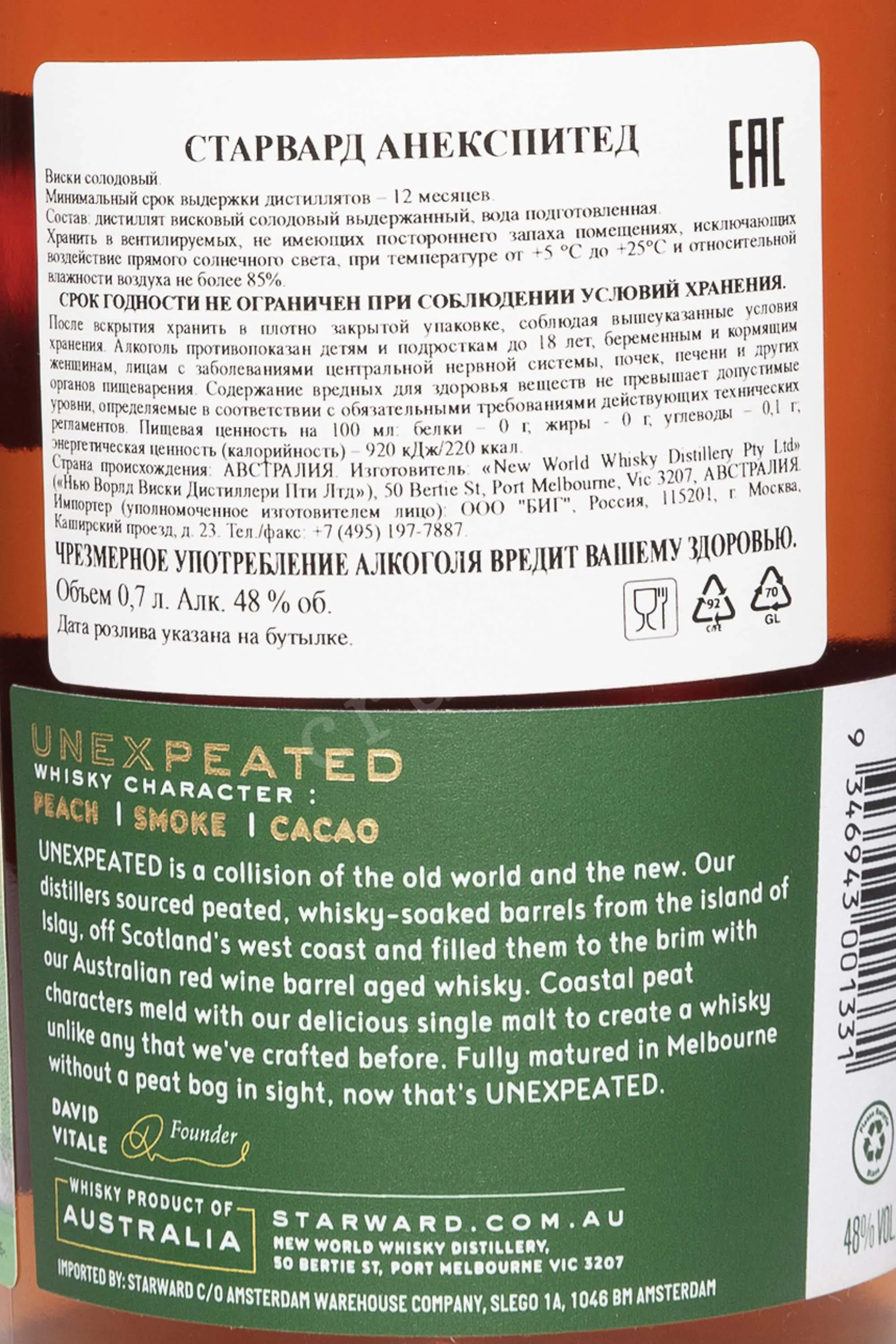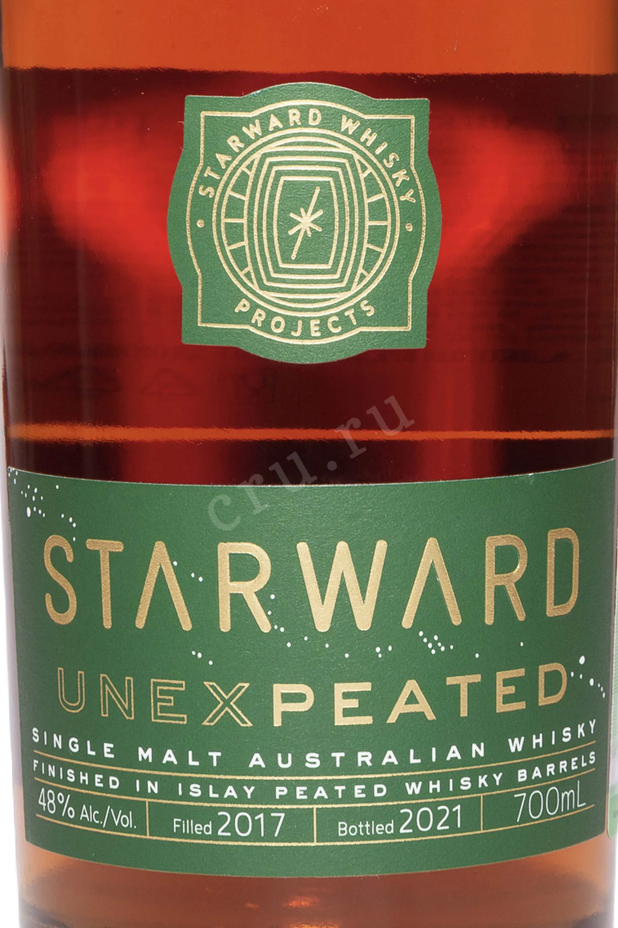 Виски Starward Unexpeated 0.7 л — это австралийский сингл молт, сочетающий контрасты двух миров: солнечного континента и туманных островов Шотландии. Напиток создан из местного ячменя и воды из австралийских источников. Сначала он выдерживается в бочках из-под австралийского красного вина, что придает ему фруктовую глубину и мягкость. Затем проходит финишное созревание в бочках из-под торфяного виски с острова Айла. Это создает необычное соединение дымности и фруктовой свежести. Уникальность Старвард Анекспитед заключается в многослойном вкусе и инновационном подходе к созреванию. Виски получил высокие оценки критиков, двойную золотую медаль на San Francisco World Spirits Competition и звание «Мастер» на The World Whisky Masters.