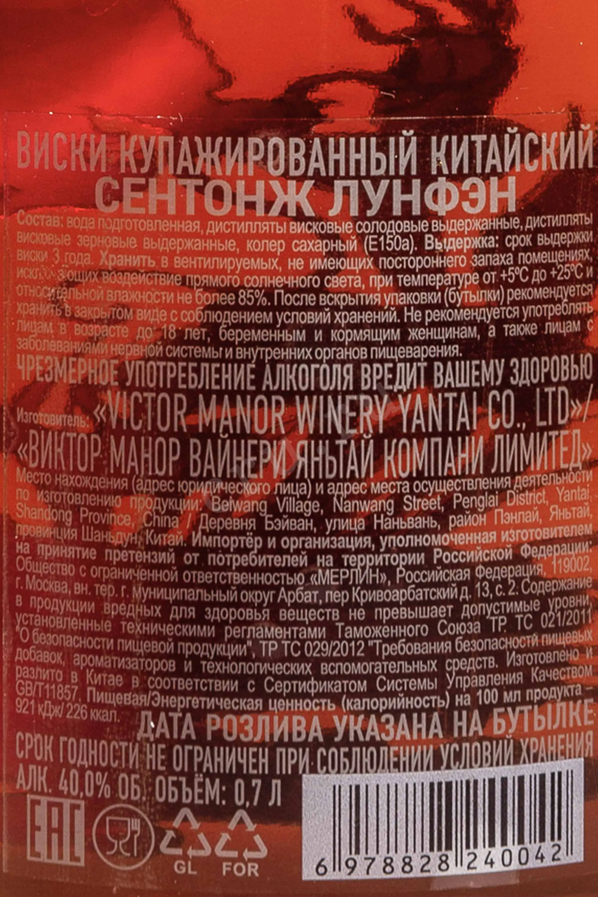 Виски Saintonge Long Feng в подарочной упаковке 0.7 л — китайский бленд с выверенной и аккуратной стилистикой. Напиток создан с учётом современных азиатских подходов к производству и ориентирован на мягкий, сбалансированный профиль. В основе используются солодовые и зерновые спирты. Перегонка проводится с контролем температуры, что позволяет сохранить чистоту вкуса. Выдержка осуществляется в дубовых бочках (не менее 3 лет), в том числе с повторным наполнением, благодаря чему вкус формируется без резкой древесной доминанты. Название Лунфэн отсылает к образам дракона и феникса, традиционным символам гармонии и силы в китайской культуре. Виски выпускается в подарочной упаковке и позиционируется как премиальный продукт для неспешной дегустации.