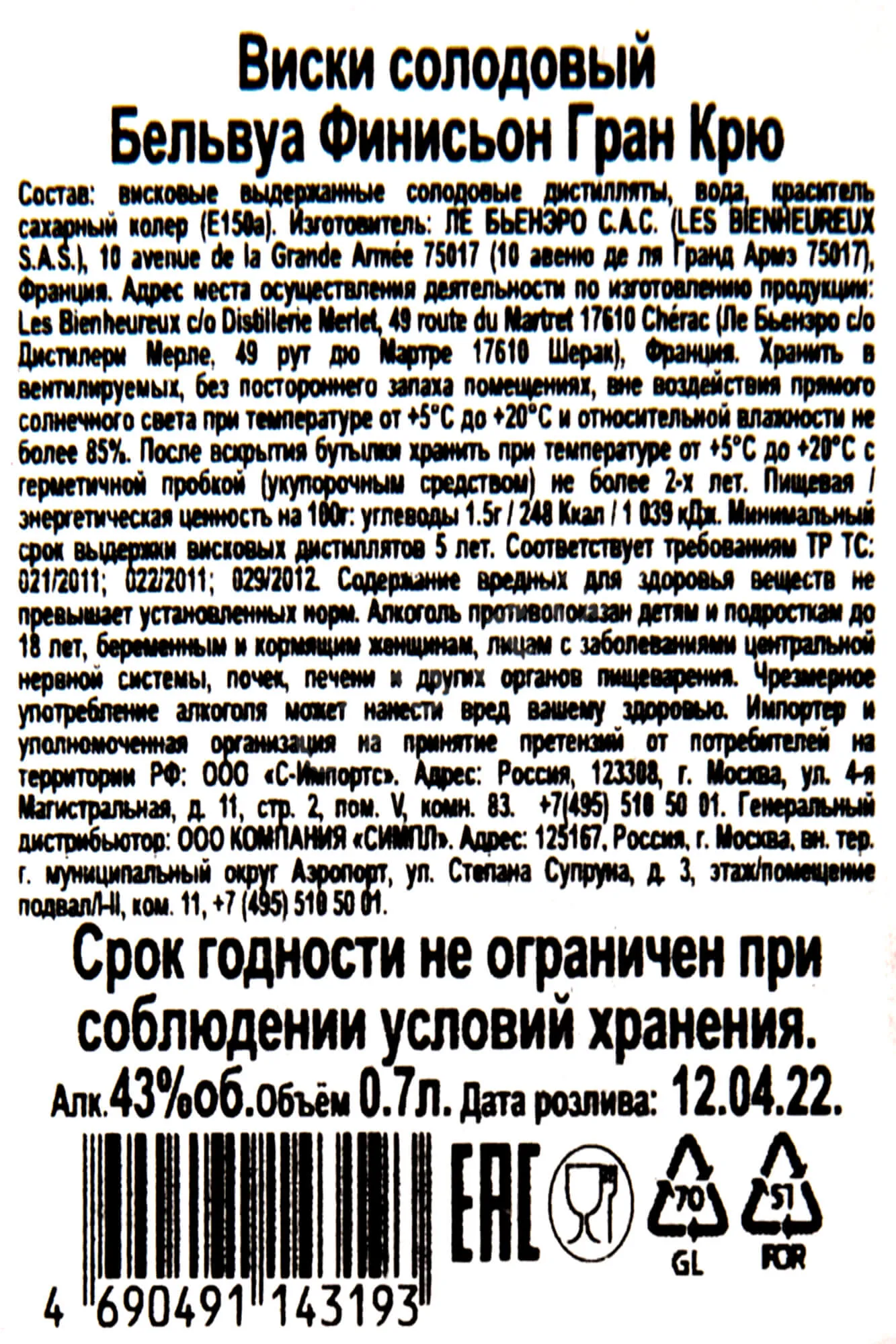 Бельвуа Финисьон Трипл Молт Гран Крю в подарочной упаковке 0.7